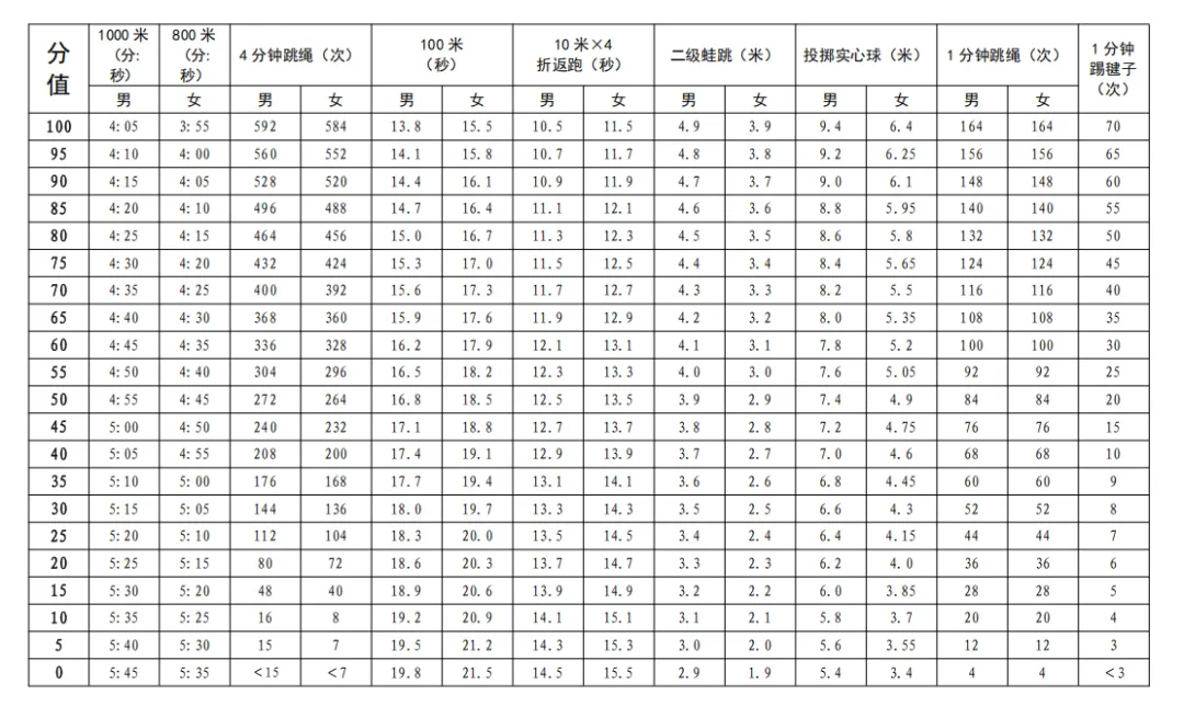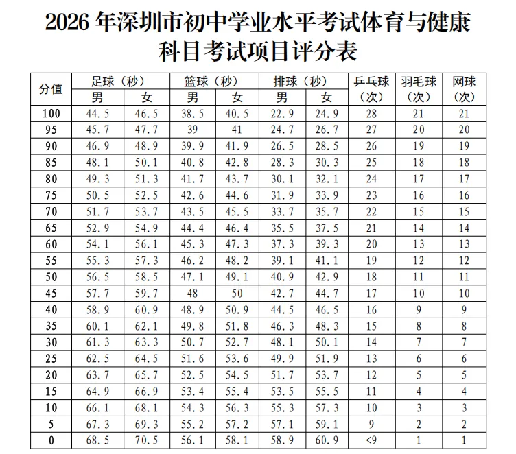 资料来源:深圳教育《2026年深圳市初中学业水平考试体育与健康科目考试项目规则和评分标准》
