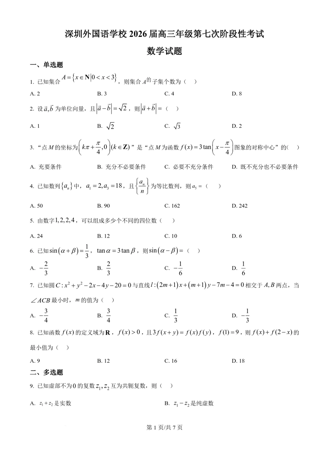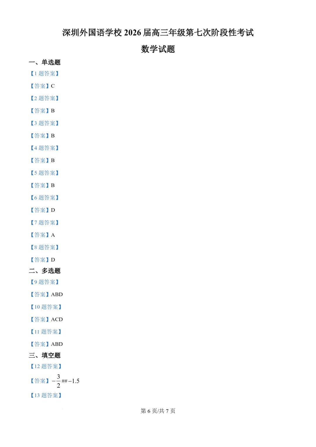 >深圳外国语学校2026届高三年级第七次阶段性考试数学试题+答案