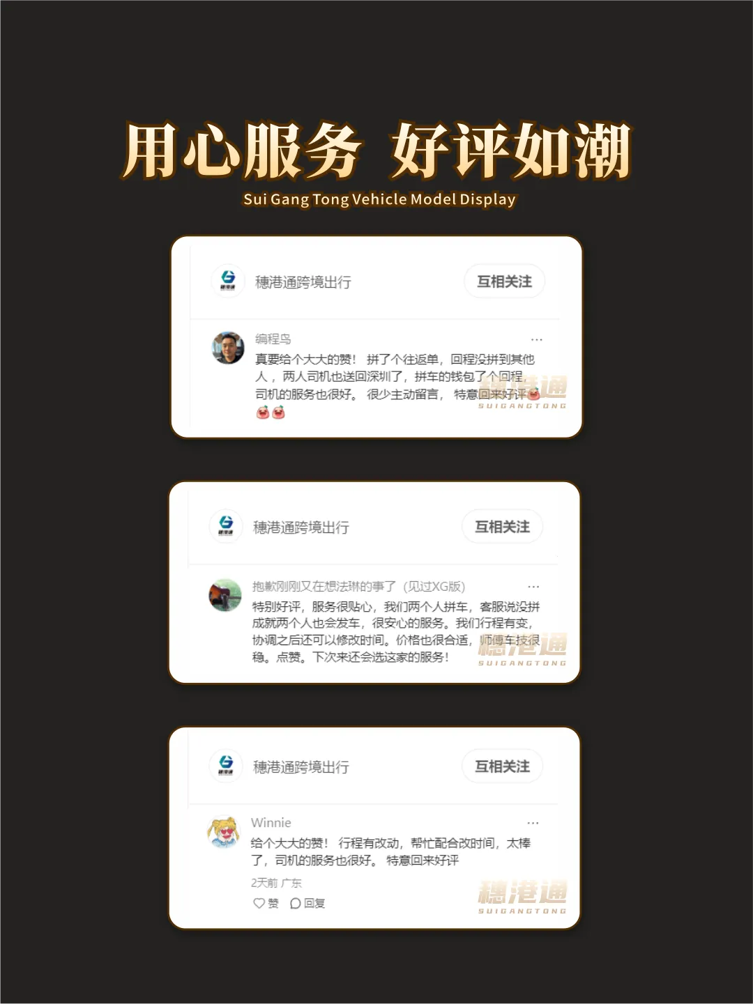 - 双语司机,沟通无壁垒:司机均精通中英双语,熟悉香港通关流程与深圳会展场馆路线,可全程为国外客户提供指引、沟通服务,避免衔接断层,让客户全程安心;