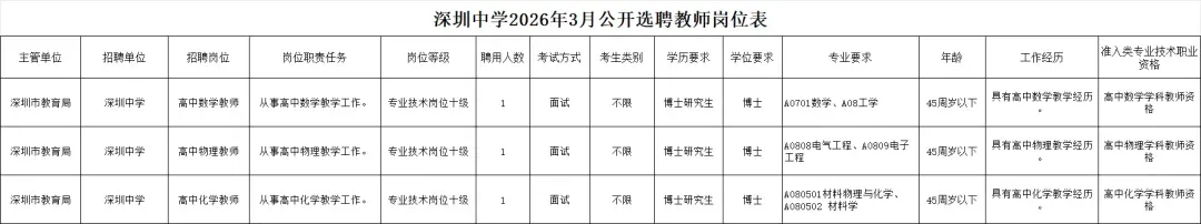 深圳中学2026年3月公开选聘教师3名,应聘人员可通过深圳中学网站(https://www.shenzhong.net/)、深圳市教育局网站(http://szeb.sz.gov.cn/)、深圳市人力资源保障局网站(http://hrss.sz.gov.cn/)查阅具体的招聘信息,具体岗位见《深圳中学2026年3月公开选聘教师岗位表》(以下简称《招聘岗位表》,附件1)。现就有关事项公告如下: