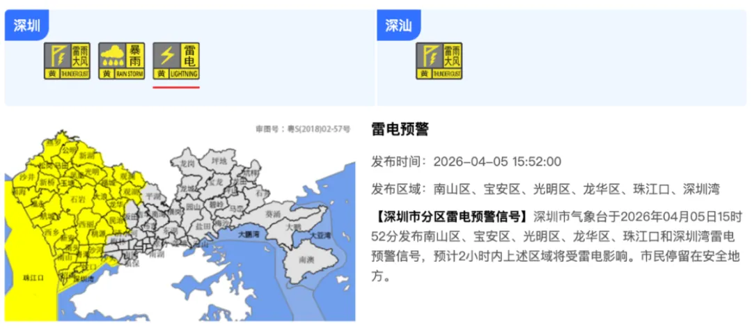 【深圳市分区雷电预警信号】深圳市气象台于2026年04月05日15时52分发布南山区、宝安区、光明区、龙华区、珠江口和深圳湾雷电预警信号,预计2小时内上述区域将受雷电影响。市民停留在安全地方。
