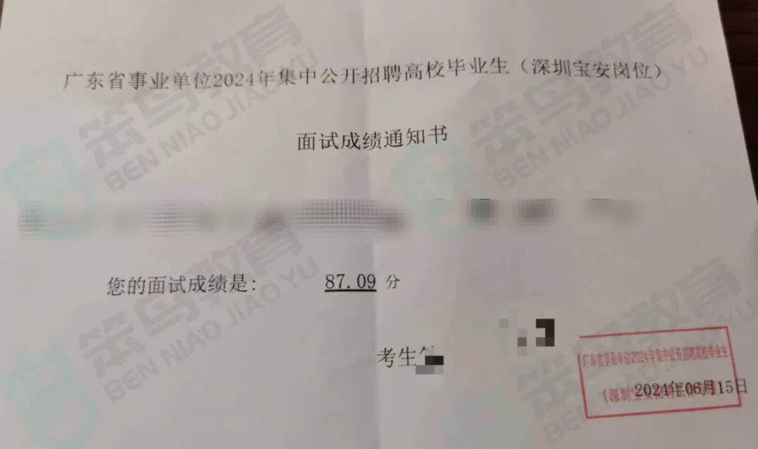次我选择了梁老师的小班,就是为了能够更加针对性的提升自己的答题水平。在面试班的学习过程中,我也又重新学习了一遍面试的相关题型,也让我对自己比较薄弱的题目掌握的更加的深入,并且梁老师和助教肖老师都对我的答题提供针对的指导意见,也帮助我在后续的面试中能够成功的翻盘。所以在面试的学习中我建议一定要对每个题型都要深入了解才能够在考场上自如地应对,比如在统考面试中就出了现场模拟题,这种题型之前在深圳统考面试中出现的次数是非常少的甚至可以说没有。这种题型虽然跟人际沟通的回答要点很相似,但是答题的方式很不相同,而我之前在国考面试备考中就深入学习了这一类题型,也让我能够更好地应对考场题目,取得高分。
