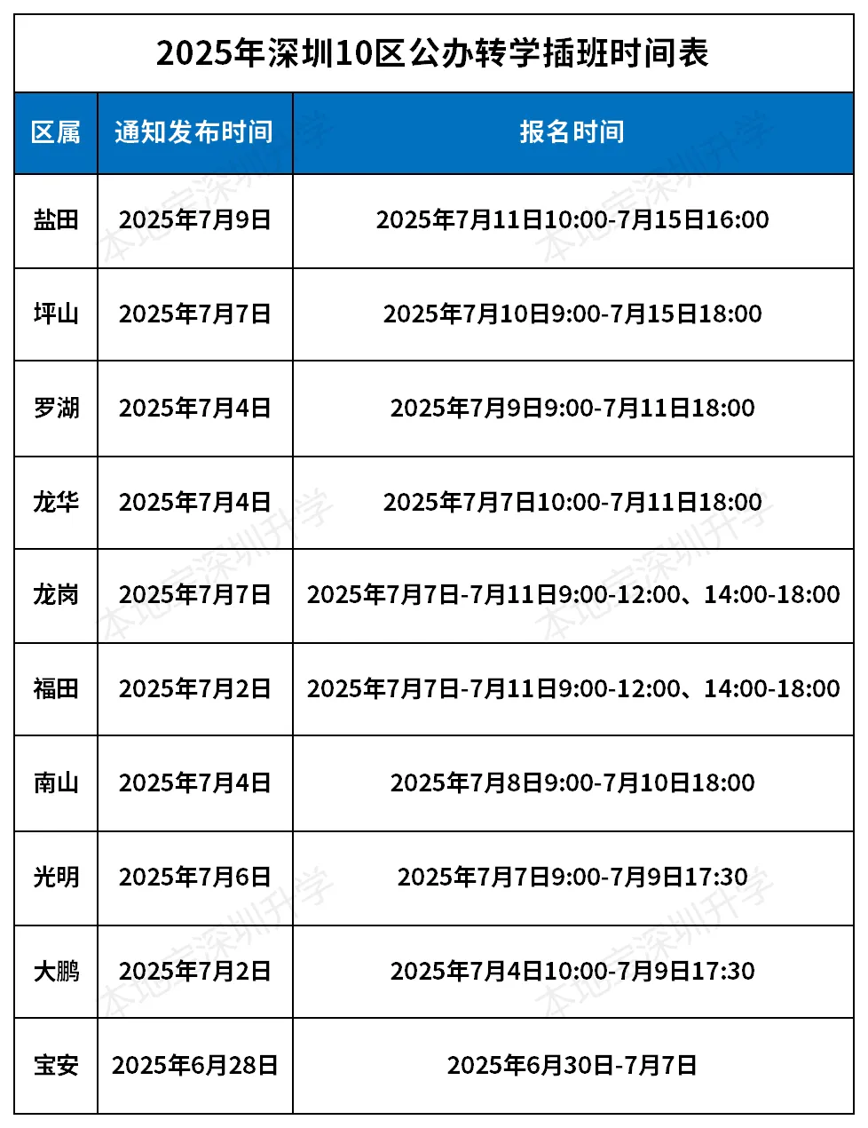 各区通知发布和报名时间不统一,近2年都是宝安区第一个发布插班通知的