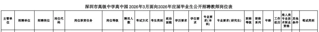 1.深圳市高级中学高中园2026年3月面向2026年应届毕业生公开招聘教师岗位表
