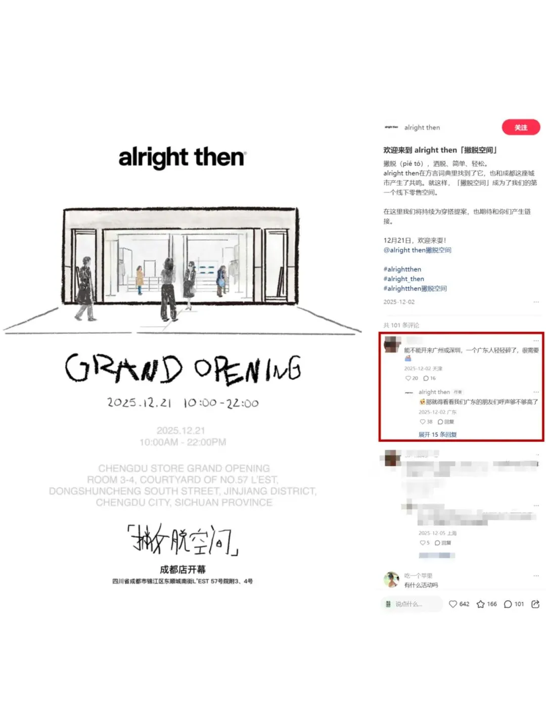 ✨其实早在2025年12月,alright then在成都开出第一家线下门店时,粉丝们就开始频频许愿,盼着它能来广东落地。这份期待,终究没有落空~