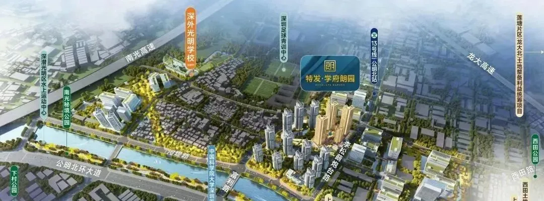 特发学府朗园,项目位于光明区公明李松萌炮台路与志康路交汇处,项目西北侧是深圳外国语光明学校,目前周边整体还是以工业园区及民房为主,13号地铁线“公明北站”距离约150米。处于李松蓢利益统筹项目地块中,项目将结合“产城融合、以人为本、低碳生态”的规划理念,重点关注产业升级发展、居住品质的提升、生产生活配套服务优化等方面,预计总投资额约100亿元,成为茅洲河畔百万平方米产城融合的超大型宜居宜业社区。
