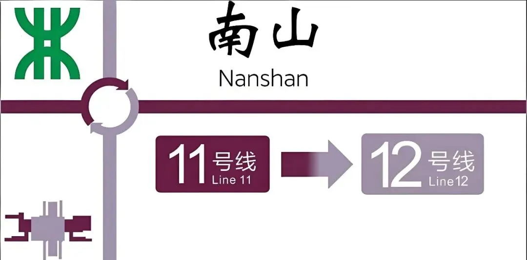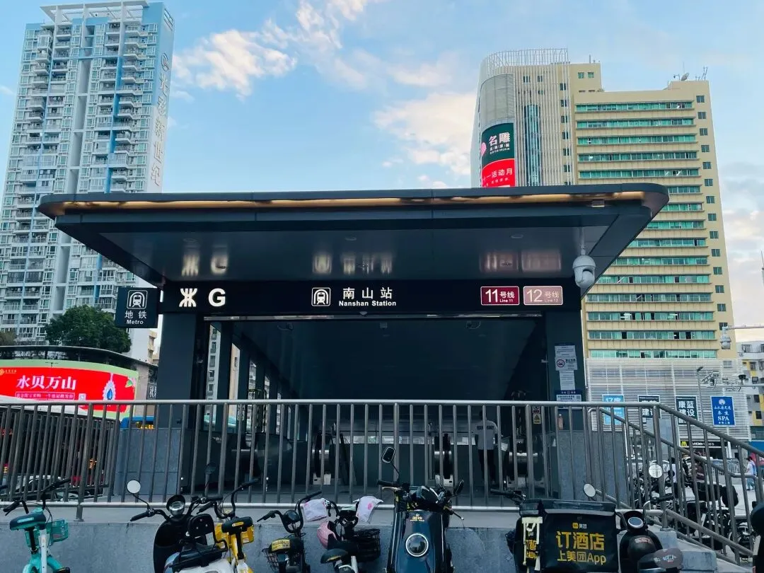 南山站位于深圳市南山区桂庙路与南山大道交汇处,是深圳地铁11号线(机场线) 与12号线(南宝线) 的双线换乘大站。11号线连接福田中心区、深圳宝安国际机场及东莞,12号线纵贯南山区、宝安区,两条线路在此交汇,形成南油片区最核心的交通枢纽。