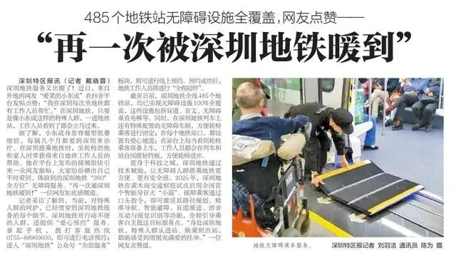 记者采访了解到,当前,对特殊人群的呵护,已经贯穿到深圳地铁服务的每个细节。深圳地铁对行动不便的人群,还提供“爱心预约”服务。拿起手机,拨打客服热线0755-88960600,即可进行电话预约;进入“深圳地铁”公众号“为您服务”板块,则可进行线上预约。预约成功后,地铁工作人员将进行“全程陪伴”。