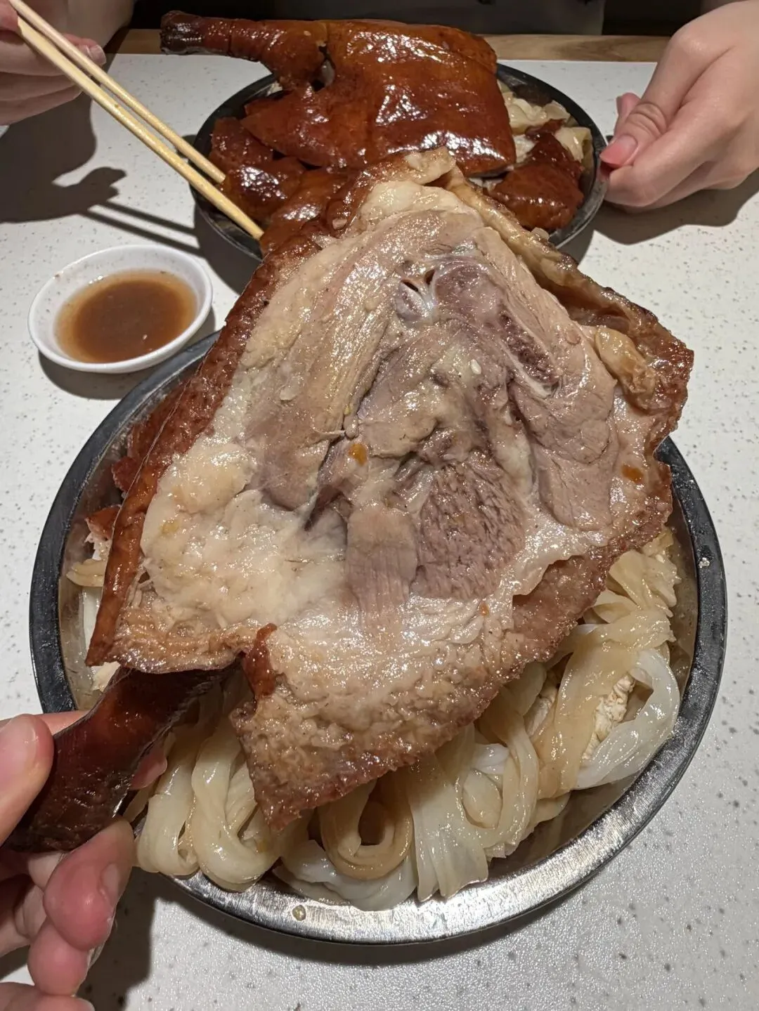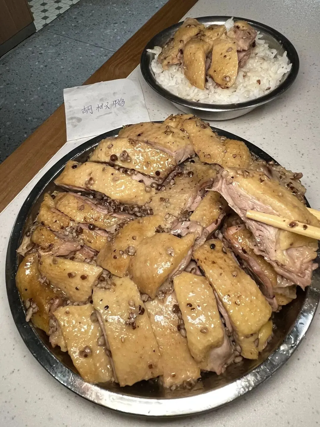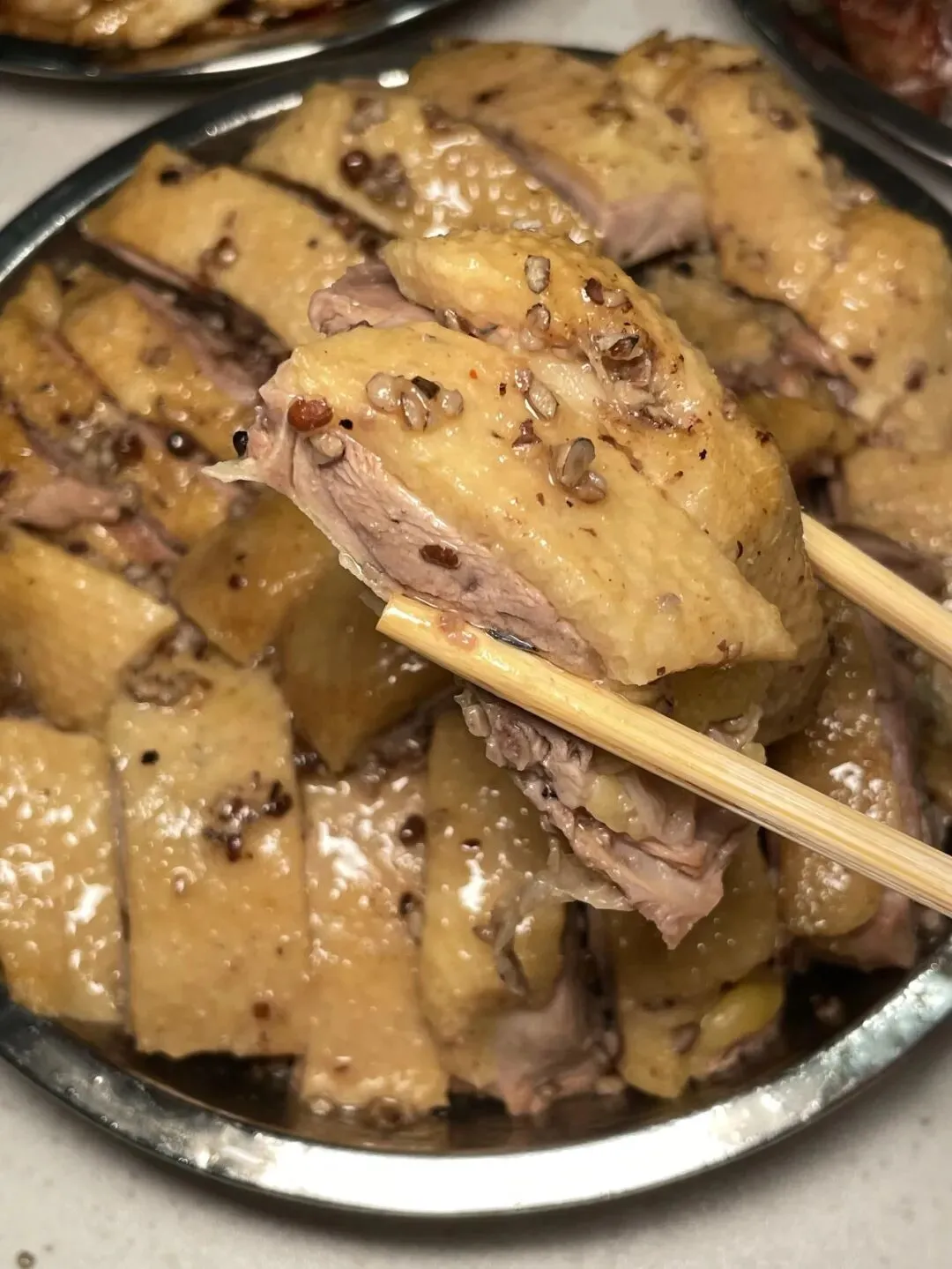 夹起一块,鸭皮油亮,肉质紧实。咬下去的第一口,胡椒味先冲上来——浓郁,但不辣,不呛,不抢戏。鸭肉嫩滑,不柴不腥,连骨头缝里都渗着胡椒和酱料的香气。越嚼越香,越香越想啃,最后连骨头都要嗦两下才舍得扔。