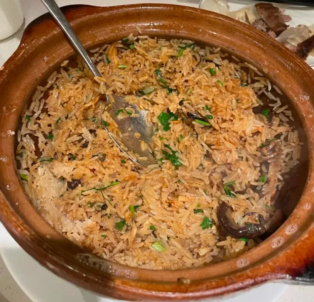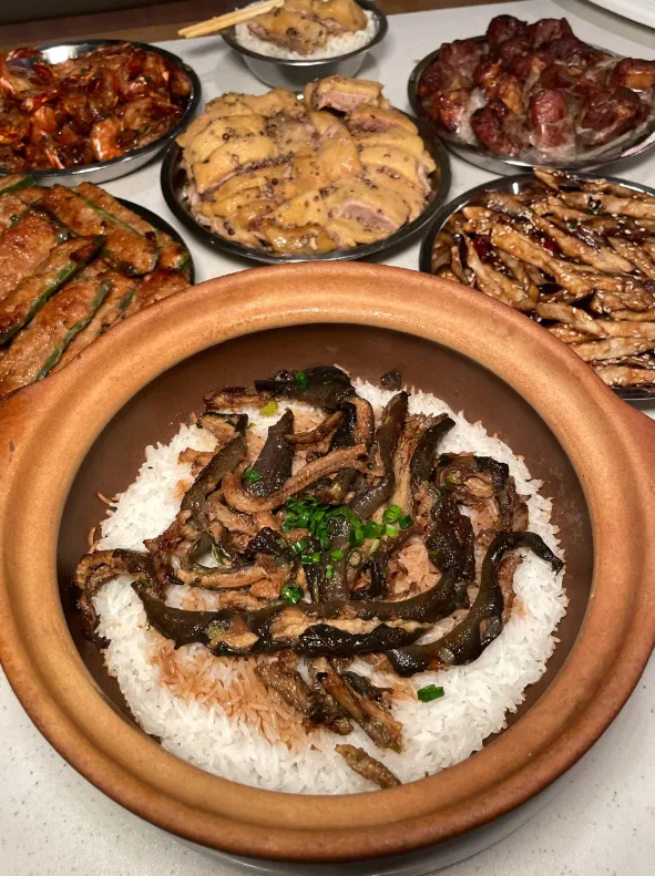 煲仔饭端上桌的时候,盖子一揭,热气裹着鳝鱼的鲜香扑面而来。米饭粒粒分明,鳝鱼切得大块,嫩滑得筷子一夹就断。最绝的是锅底那一层金黄的锅巴——焦脆、不糊、不粘牙,嚼起来“咯吱咯吱”响,比米饭本身还香。