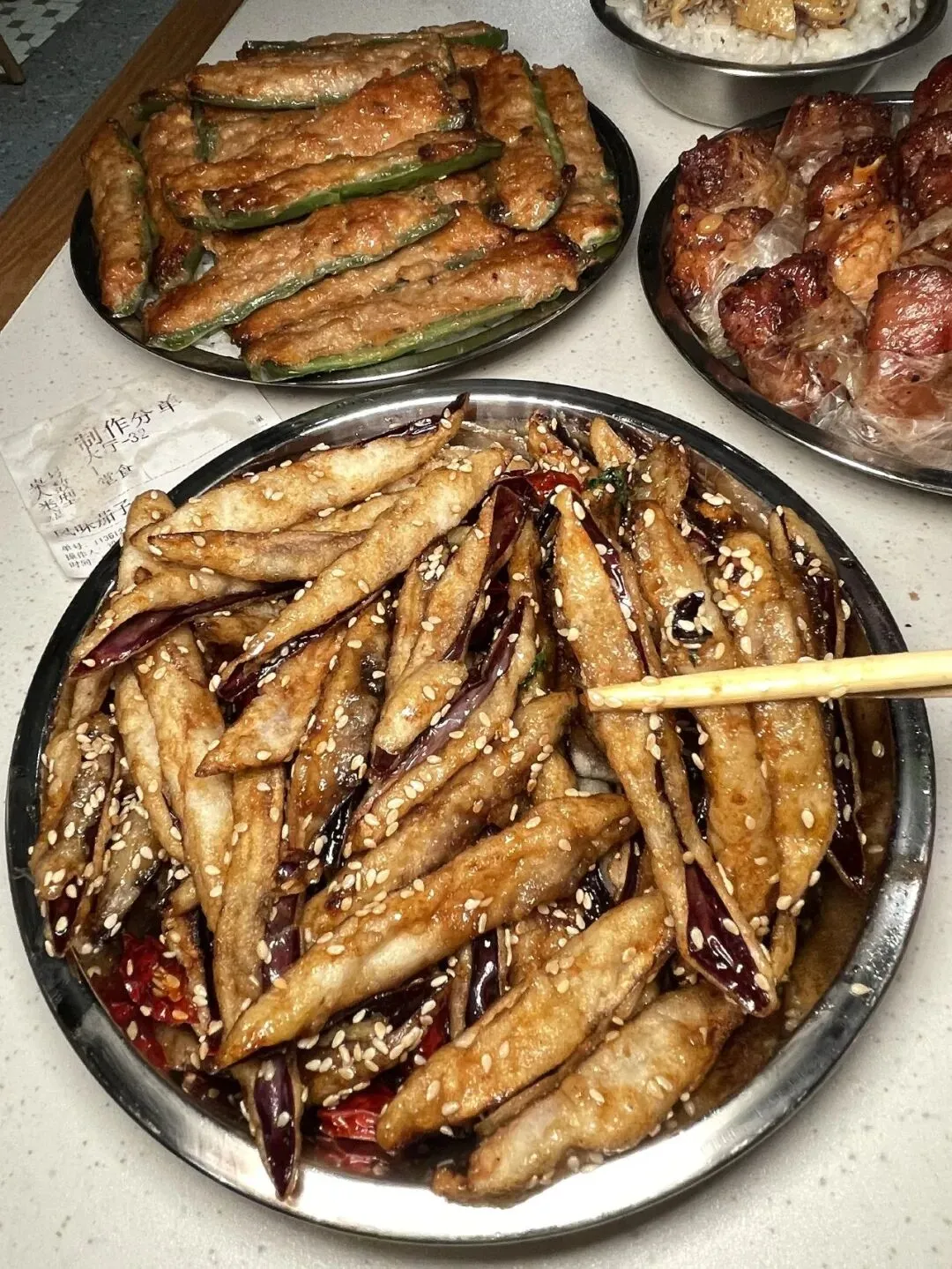 还有一道不得不提的菜——风味茄子。说实话,我平时是不怎么吃茄子的,总觉得软塌塌的没什么意思。但这道茄子端上来,第一筷子下去就愣住了。外皮炸得酥脆,裹着一层薄薄的糖醋汁,咬开里面还是嫩嫩的,带着茄子本身的清甜。那种外酥里嫩、酸甜适口的感觉,完全颠覆了我对茄子的偏见。不喜欢吃茄子的人,居然被这道菜拿捏得死死的——真的好特别!