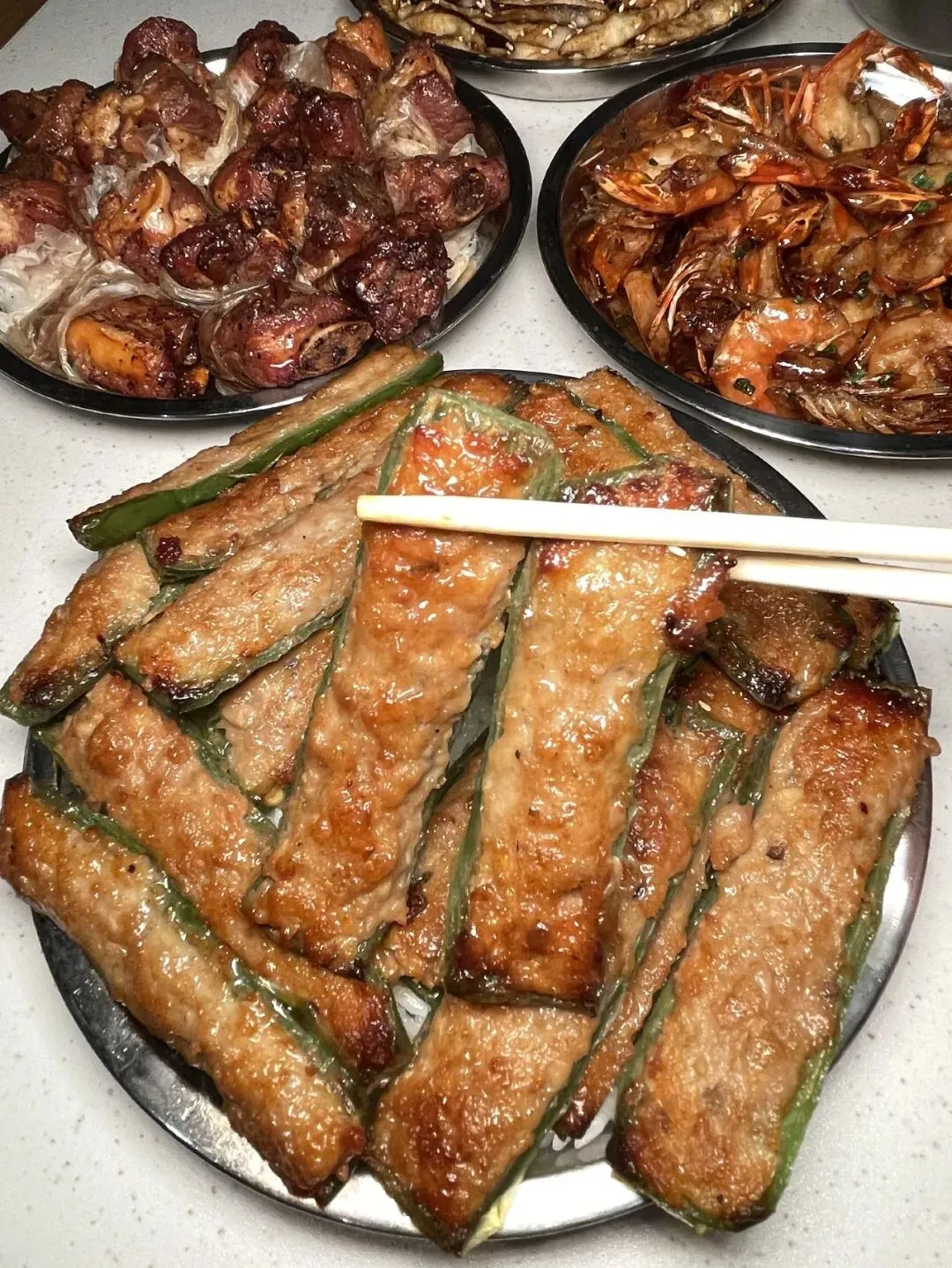 还有这道煎酿尖椒,也值得说两句。尖椒煎得表皮微微起皱,带着焦香,里面的肉馅紧实弹牙,一口咬下去,青椒的清爽和肉香搅在一起,很搭。一盘上来有七八条,分量实在,两个人吃都够。整体调味刚好,不咸不淡,非常可口——算不上惊艳,但就是那种会让你一筷子接一筷子、不知不觉就扫光的家常好味。12点半左右到店,放眼望去,全是本地居民。有老人带着孙子,有一家老小围坐一桌,有几个大叔边吃边聊着家长里短。