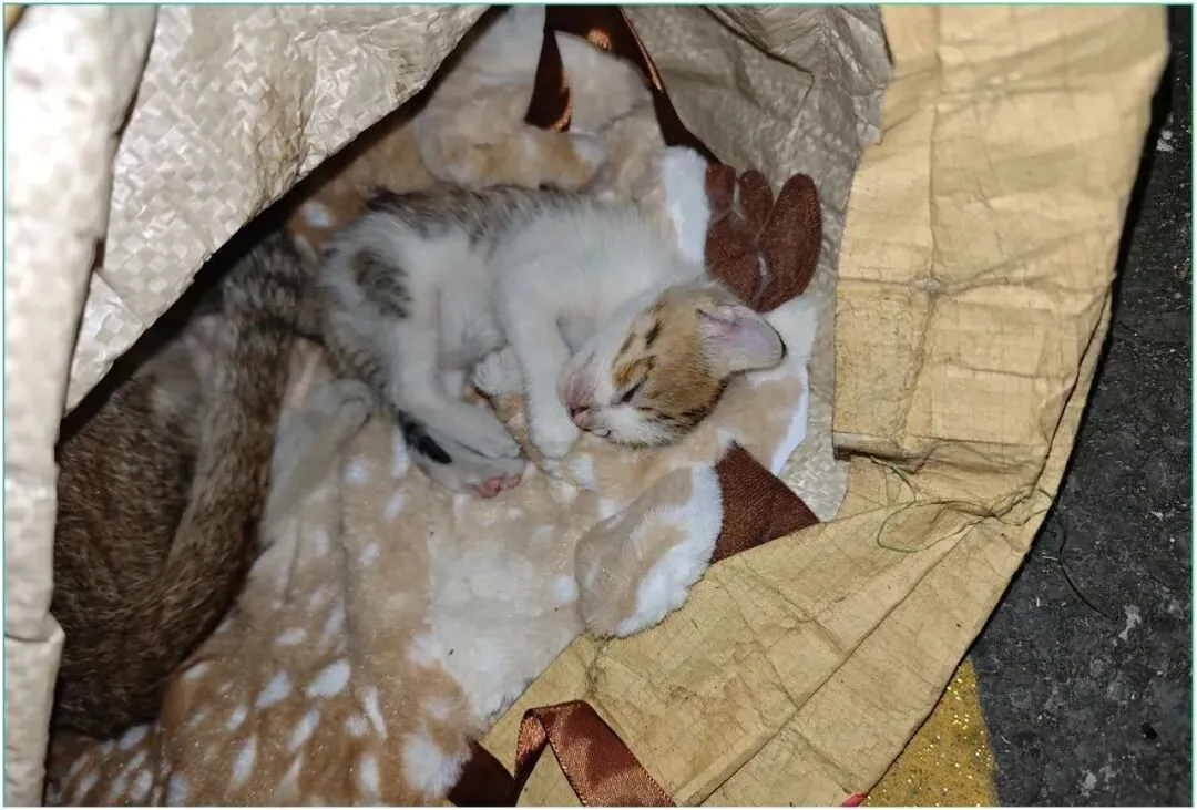 一只狸花猫妈妈侧躺在袋子里,身下压着一块脏兮兮的小毯子,三只小奶猫挤在她怀里,最小的那只眼睛都还没睁开,猫妈看到我的时候没有跑,也没有凶我,只是抬了一下头又放下了,像是已经习惯了被人摆布,也习惯了没人在意。袋子里面闷热不透气,三只小猫身上都是潮湿的,我用手摸了一下猫妈的鼻头,干燥发烫,我知道她在发烧,但她还是把三个孩子护在肚子底下,一步都不肯挪开。