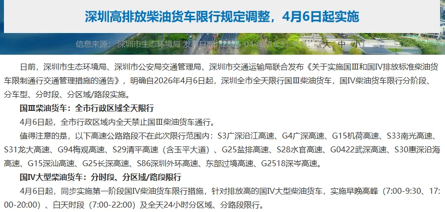 自2026年4月6日起,深圳市将正式实施国Ⅲ、国Ⅳ柴油货车限行措施: