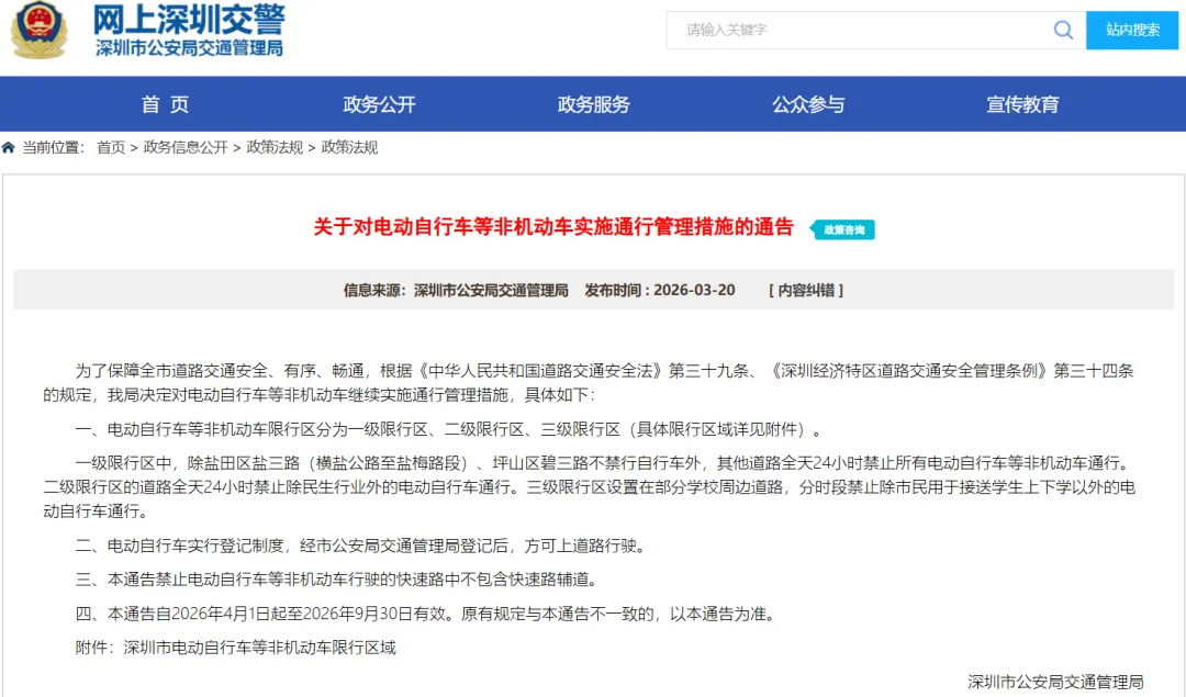 2026年3月20日,深圳市公安局交通管理局官网发布文章《关于对电动自行车等非机动车实施通行管理措施的通告》,通告提到: