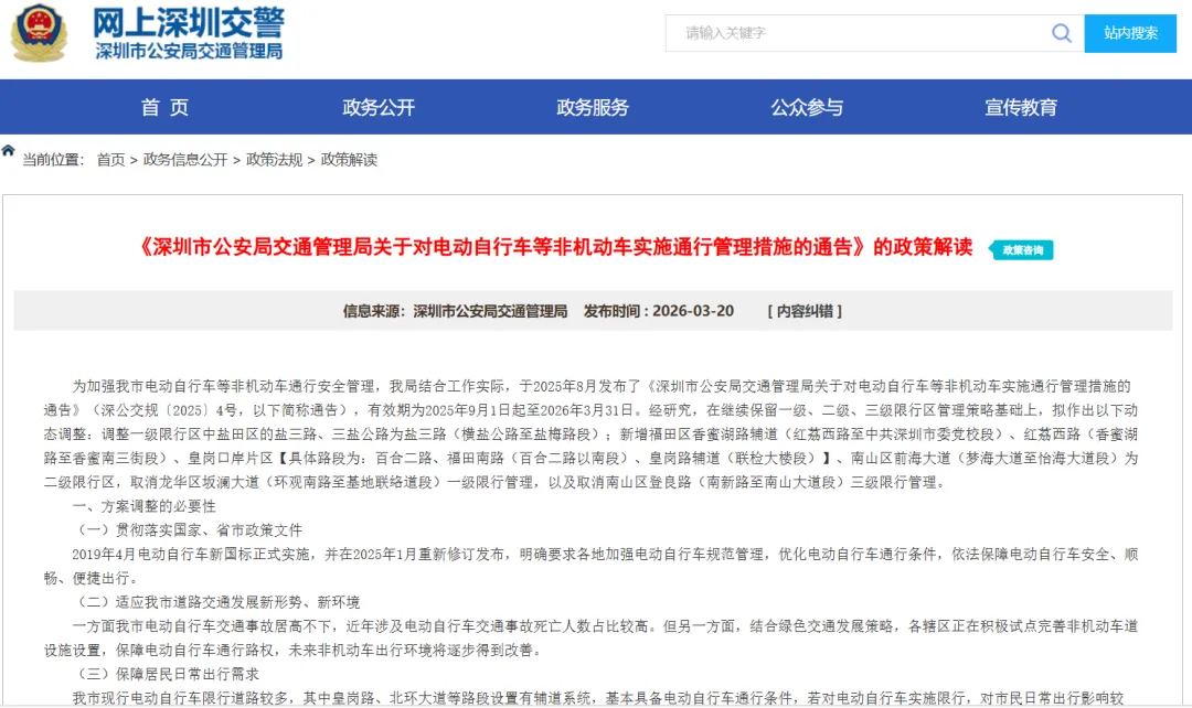 上述通告中还有一个文件链接,我打开后同样是在2026年3月20日发布的是《“深圳市公安局交通管理局关于对电动自行车等非机动车实施通行管理措施的通告”的政策解读 政策咨询》。