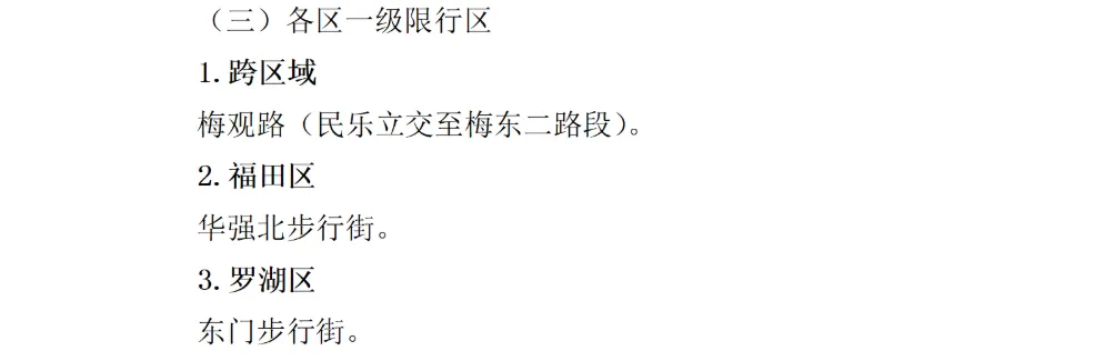 在附件《深圳市电动自行车等非机动车限行区域》中明确:福田区有且仅有一条街道是一级限行区,那就是华强北步行街。在一级限行区中,道路全天24小时禁止所有电动自行车等非机动车通行。