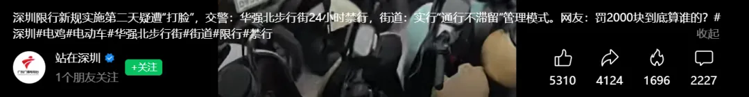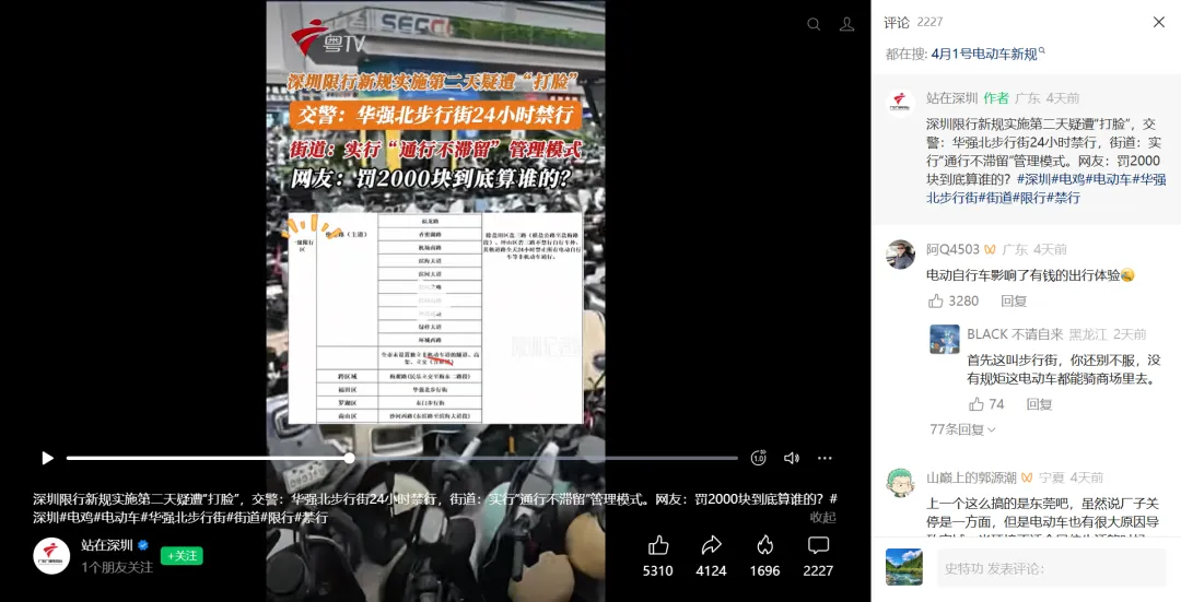 关于新规下的华强北自行车,广东广播电视台率先发视频《深圳限行新规实施第二天疑遭"打脸”,交警:华强北步行街24小时禁行,街道:实行”通行不滞留”管理模式。网友:罚2000块到底算谁的?#深圳#电鸡#电动车#华强北步行街#街道限行#禁行》。