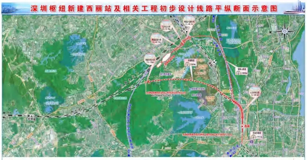 新建深圳西丽站及相关工程正线起自赣深高铁既有羊台山隧道,终至西丽站西侧与在建深江铁路工程分界,正线长14.125km。全线设西丽站1座车站,规模13台25线。配套建设深圳北动车所1座,总规模14条检查库线、80条存车线。