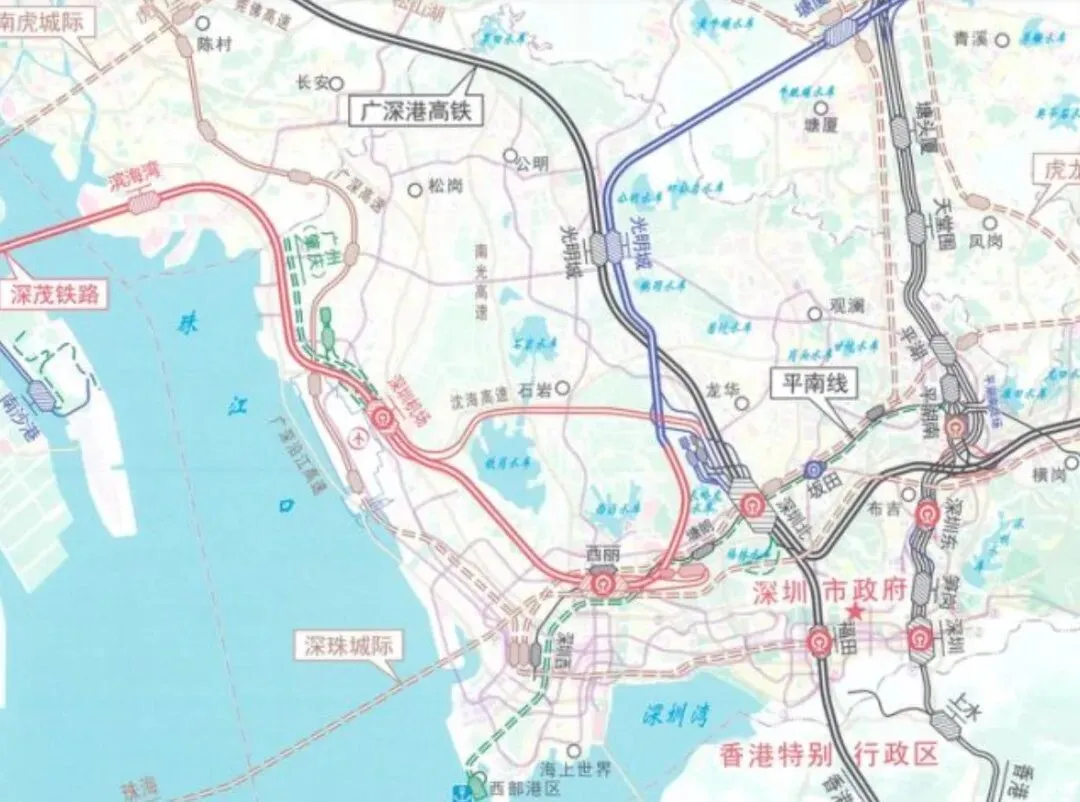 西丽高铁站未来将引入4条高铁——赣深高铁、深茂铁路、深汕铁路、深珠高铁;2条城际铁路——深惠城际、深莞增城际;4条地铁线路——13号线、15号线、27号线和29号线,形成“4高铁+2城际+4地铁”的多层级轨交网络,完善大湾区轨道交通网络布局。