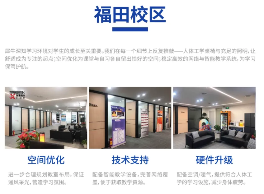 深圳犀牛教育在南山和福田均有线下校区,我们在每一个细节上反复推敲,人体工学桌椅与充足的照明,让舒适成为专注的起点,为学习保驾护航。