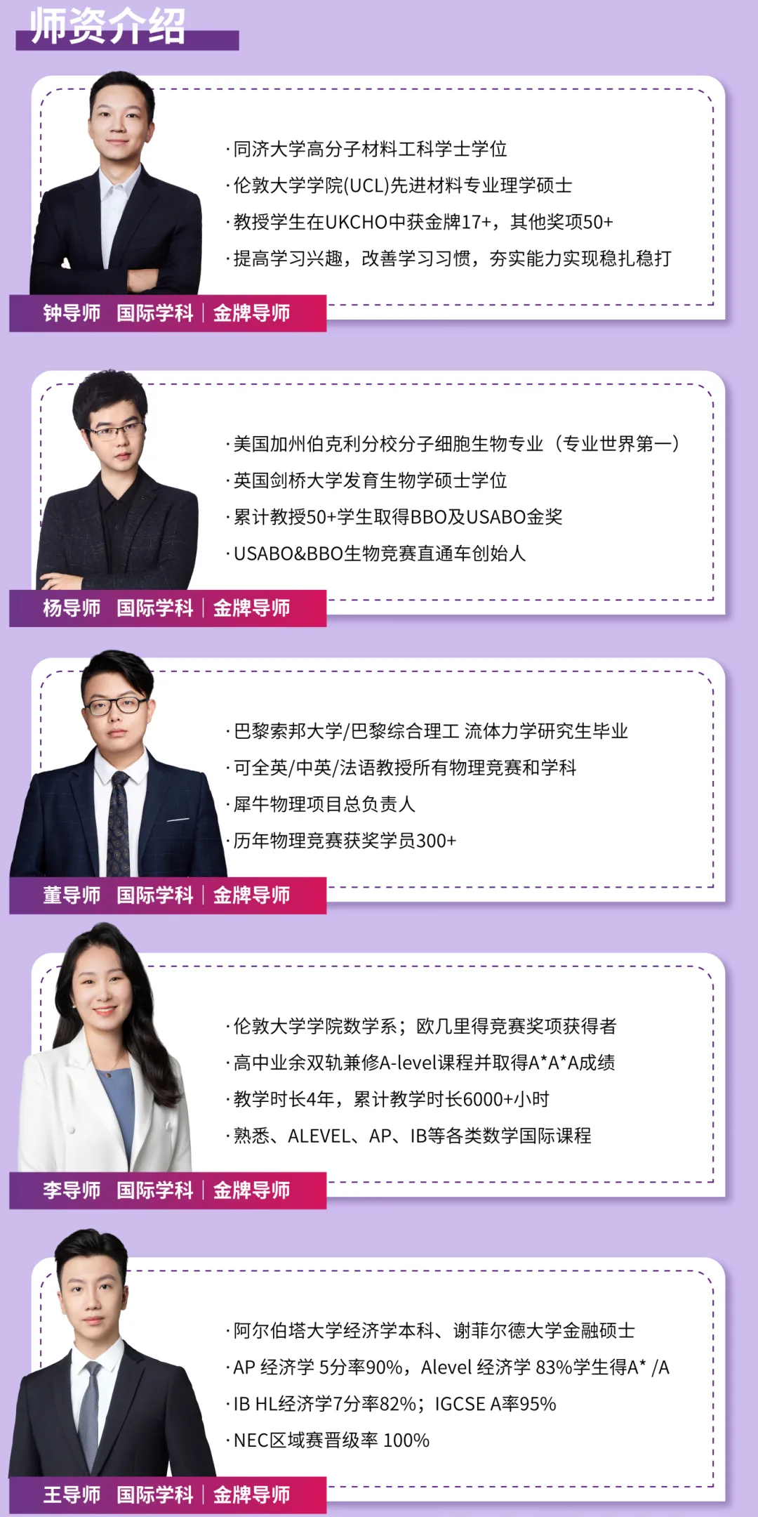 这些导师在Alevel等国际课程的授课经验为4年以上,毕业于剑桥大学、伦敦政治经济学院、伦敦大学学院、帝国理工大学等海外名校!瞄准Alevel考试动向和备考难点,带领学生精准提升!