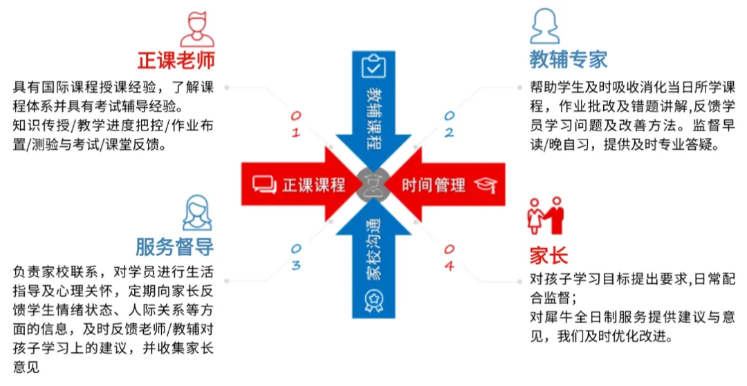 我们犀牛ALevel培训冲刺班实行4V1教学模式,由授课讲师+学科助教+专属班主任+课程顾问组成,全程督学,实时跟踪学习进度、反馈学习效果,及时调整备考计划;