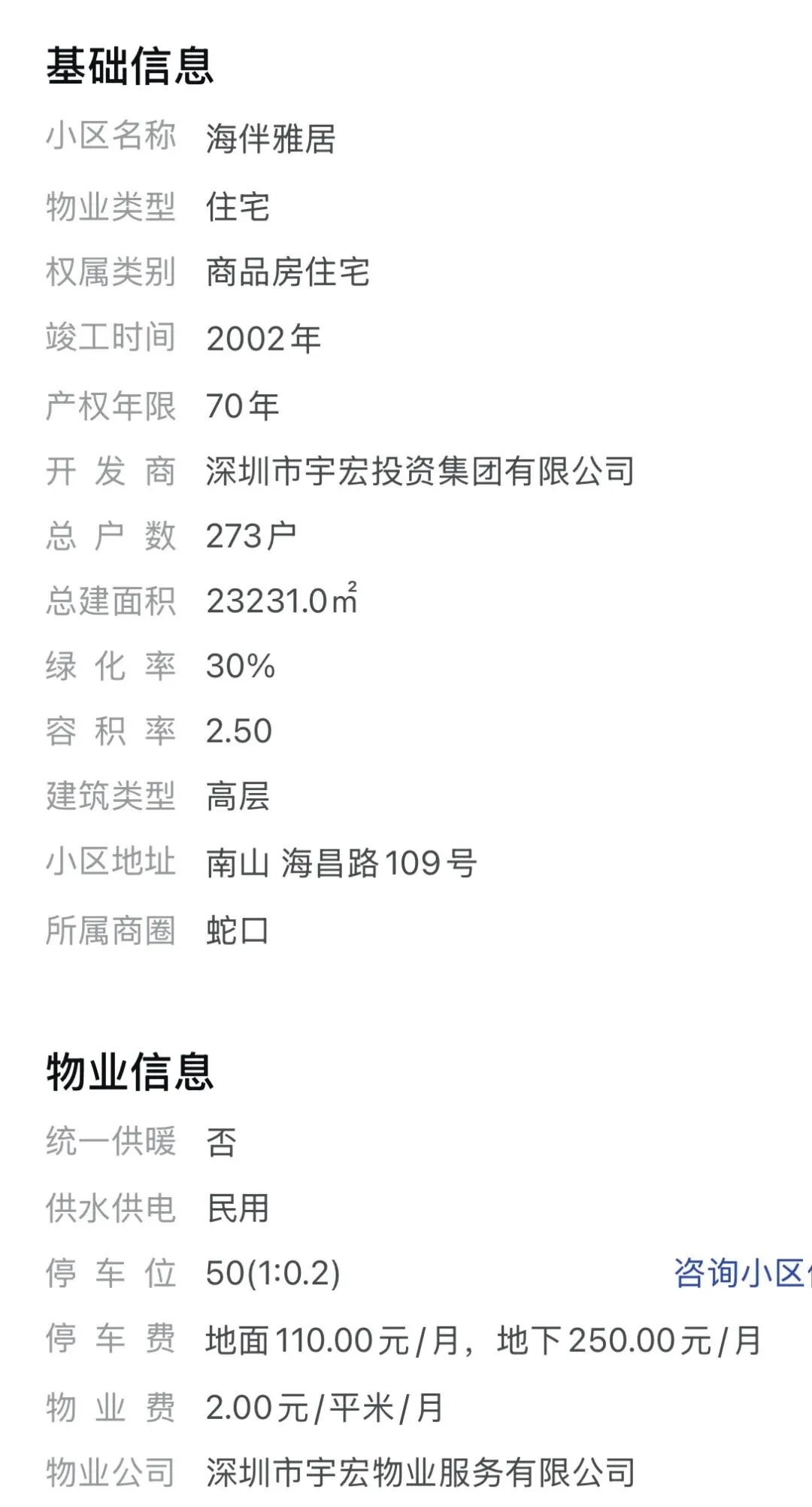 楼层好,无遮挡,小户型可按揭首付低,上车容易。海伴雅居是2002年建成,70年产权商品房,物业费2元每月每平方,民水民电。海伴雅居座落在深圳市南山区蛇口海昌街上,分成A栋和B栋,由深圳市宇宏集团有限公司开发,于2002年2月份竣工。占地面积3638平方米,建筑面积23231平方米。A栋每层10户,B栋每层8户。房子很适合刚需一家人居住,房子近校园 地铁公园,生活很方便,买来自住是最适合的。蛇口海上世界商圈配套齐全佳发商场万店通好乐生活便利店聚色油漆万福佳生活市东门万福佳生活市佳发商场金汇城百货四海宜家购物广场小区内还有一个幼儿园。海伴雅居拥有1所小学,海湾小学,学校老师很好,孩子很喜欢。交通出行有地铁水湾(蛇口线):水湾站C口(步行约600米),地铁水湾站。海伴雅居旁边有1条地铁线:2号线,有3个地铁站点,如水湾、海上世界,平均距离站点710米,步行到站点约8分钟,D口(步行约800米)小区门口公交车站(海昌站)花果山站(22;70;79;122;204;226;231;233;k105;k204;1夜;4夜;高峰专线37),公园南路站(37;109;231;233;332;b702;m242;高峰专线37)。