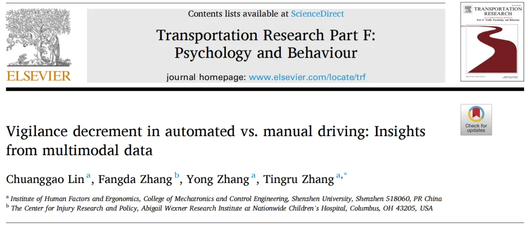 引用:Lin, C., Zhang, F., Zhang, Y., & Zhang, T. (2025). Vigilance decrement in automated vs. manual driving: Insights from multimodal data. Transportation Research Part F: Traffic Psychology and Behaviour, 112, 207-220.