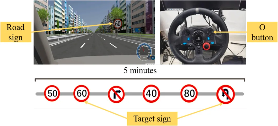 实验在驾驶模拟器上进行,系统由三块显示屏、高性能计算机及罗技方向盘与踏板组成,场景为双向六车道城市高速,限速100 km/h。驾驶过程中,被试需同时执行交通标志检测任务(目标为限速60 km/h与禁止掉头标志),每5分钟口头报告一次主观警觉性(1–7级评分)。研究使用了多套生理监测设备:Tobii Pro X3-120眼动仪采集眼动数据(采样率120 Hz),ANT Neuro eego™ mylab系统采集32通道脑电信号(采样率500 Hz),并采用三导联方式记录心电信号。所有生理数据与行为数据均以5分钟为区间进行分段处理,用于后续线性混合模型分析与锐变点识别。
