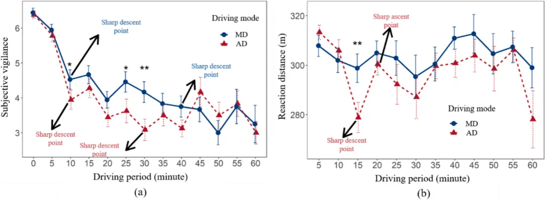 研究通过主观评分、目标检测表现及多模态生理指标(眼动、心电、脑电)系统评估了警觉性变化。结果发现,无论手动驾驶还是L2自动驾驶,主观警觉性均随驾驶时间显著下降,但自动驾驶中的下降出现更早。自动驾驶模式下,主观警觉性首次显著下降出现在10分钟,第二次在30分钟;而手动驾驶的第二次下降出现在40分钟,且在多个时间点自动驾驶的主观警觉性显著低于手动驾驶。在目标检测任务中,自动驾驶模式的反应距离在15分钟时出现显著下降,手动驾驶则保持相对稳定。