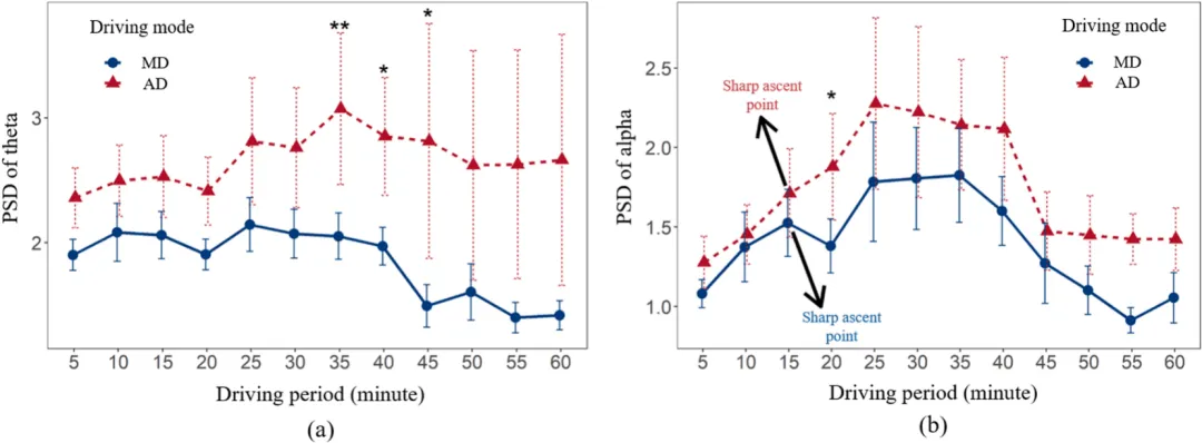 眼动指标显示,自动驾驶模式下的注视时长和注视次数下降更早,眨眼时长和眨眼次数显著增加,瞳孔直径持续缩小,而手动驾驶的瞳孔直径呈U型变化。心电指标方面,自动驾驶模式的VLF在20分钟首次显著上升,LF/HF在25分钟显著上升,均早于手动驾驶。脑电结果显示,自动驾驶模式的θ波功率在35分钟后显著高于手动驾驶,α波功率在20分钟显著高于手动驾驶,且脑电地形图显示自动驾驶模式下α波和β波在25–40分钟明显增强,主要集中在颞叶与枕叶区域。