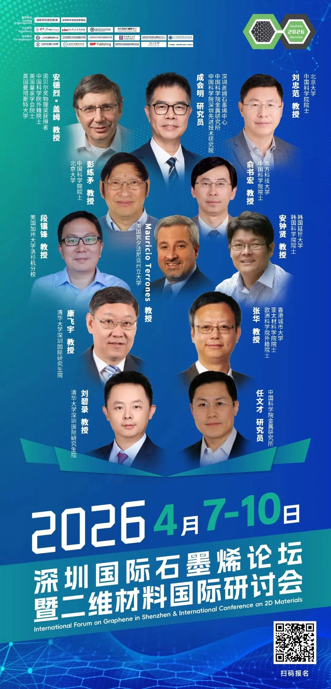 本次论坛作为石墨烯研究领域的国际盛会,荣幸地邀请到了一系列享有盛誉的科学家和学者出席并担任主讲嘉宾。中国科学院深圳先进技术研究院成会明院士和清华大学深圳国际研究生院康飞宇教授共同担任本届论坛名誉主席,诺贝尔奖获得者、中国科学院外籍院士、英国皇家学会院士,美国国家科学院外籍院士、英国曼彻斯特大学教授安德烈·盖姆(Andre Geim),美国宾夕法尼亚州立大学Mauricio Terrones教授,中国科学院院士、北京大学刘忠范教授,中国科学院院士、北京大学电子学院院长彭练矛教授,中国科学院院士、南方科技大学理学院院长俞书宏教授,韩国科学院院士、韩国延世大学安钟贤(Jong-Hyun Ahn)教授,欧洲科学院外籍院士、亚太材料学院院士、香港城市大学张华教授,美国加州大学洛杉矶分校段镶锋教授,清华大学深圳国际研究生院康飞宇教授等九位顶级院士专家领衔主讲,这些顶尖专家的参与,将会为我们带来卓越的学术见解,极大地提升论坛的学术品质和国际影响力。