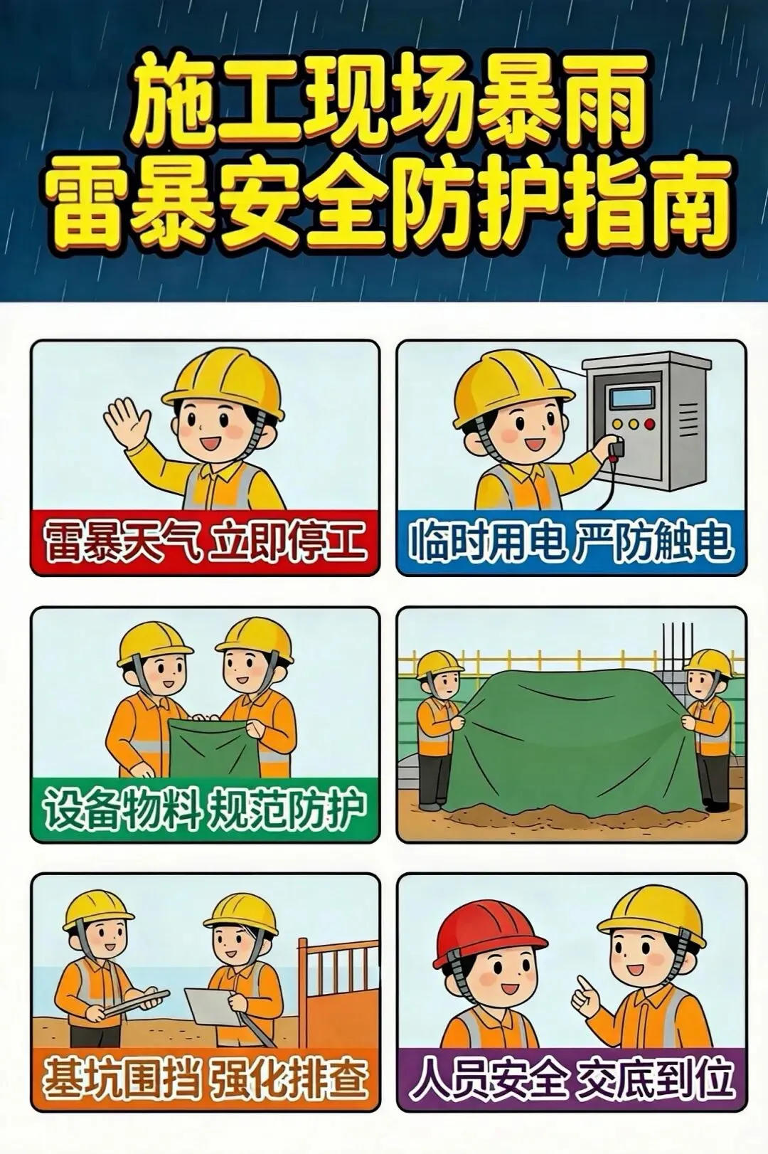 建筑施工人员密集、设备繁多,雷暴+降雨易引发触电、坍塌、坠落等事故,需严格遵守以下规范: