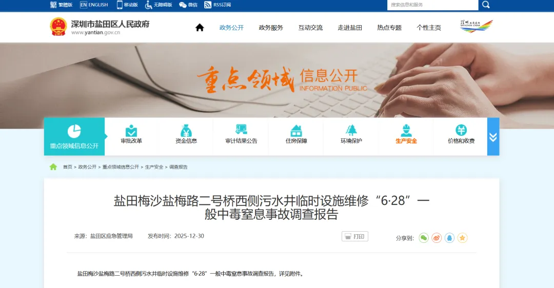 2025年6月28日凌晨,深圳盐田区梅沙街道一处污水井内发生有限空间中毒窒息事故,造成1人死亡、1人受伤,直接经济损失约183万元。2026年,官方发布的事故调查报告完整还原了这场悲剧的全貌:涉事作业单位具备有限空间作业资质,相关人员持有专项操作合格证,企业建立了完整的安全管理制度、配齐了通风检测防护设备,甚至就在事发半个月前,作业人员还在同一口污水井内,按规范完成了同类作业。可就是这样一场“熟门熟路”的常规维修,最终酿成了无法挽回的生命悲剧。