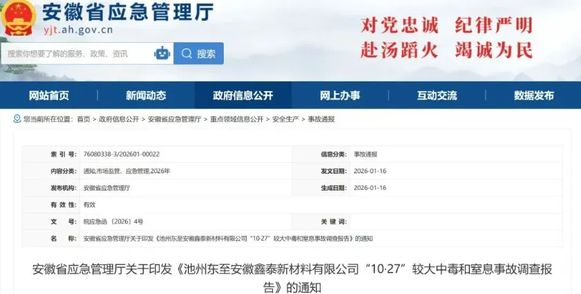 2025年10月27日20时12分许,安徽鑫泰新材料有限公司公用工程车间冷冻盐水箱更换冷冻盐水过程中发生一起较大中毒和窒息事故,造成4人死亡,直接经济损失608.75万元。