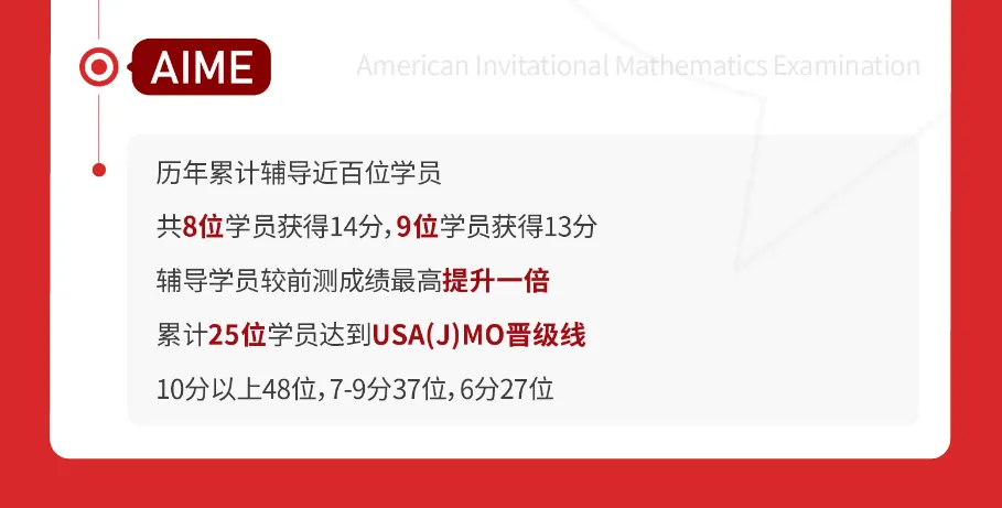 50课时基础长线班——以多年经验总结的AMC8/10/12竞赛考纲为根本,帮助学生逐个突破竞赛基础知识点,建立知识体系和简单习题的解题思路,帮助学生拿下AMC前15道题,顺利衔接AMC提高班or冲刺班,最终目的是实现能拿到的分都拿到,冲AIME晋级分数线。