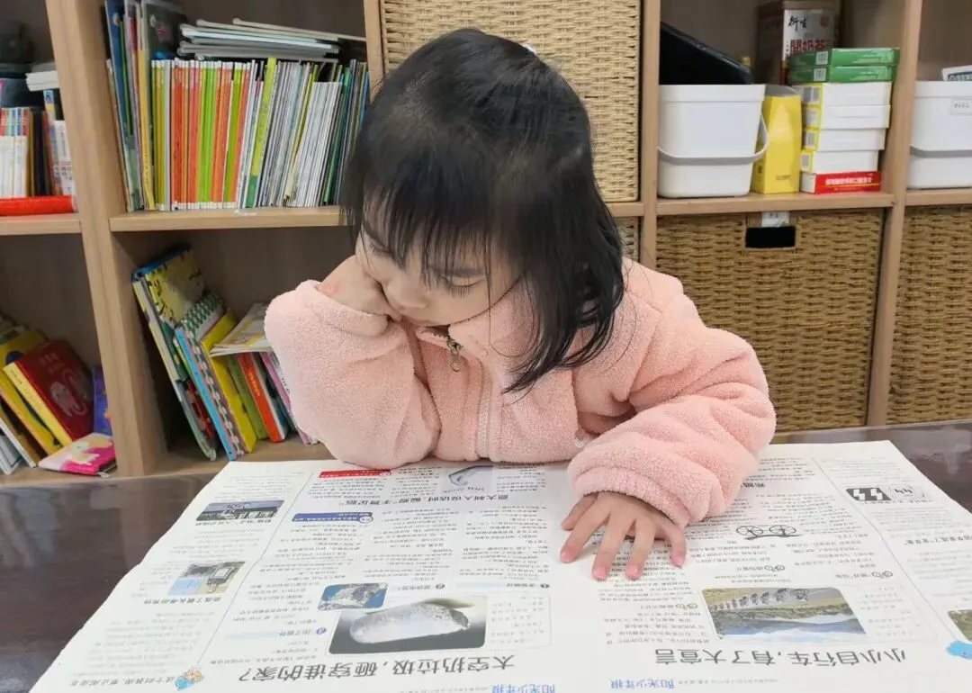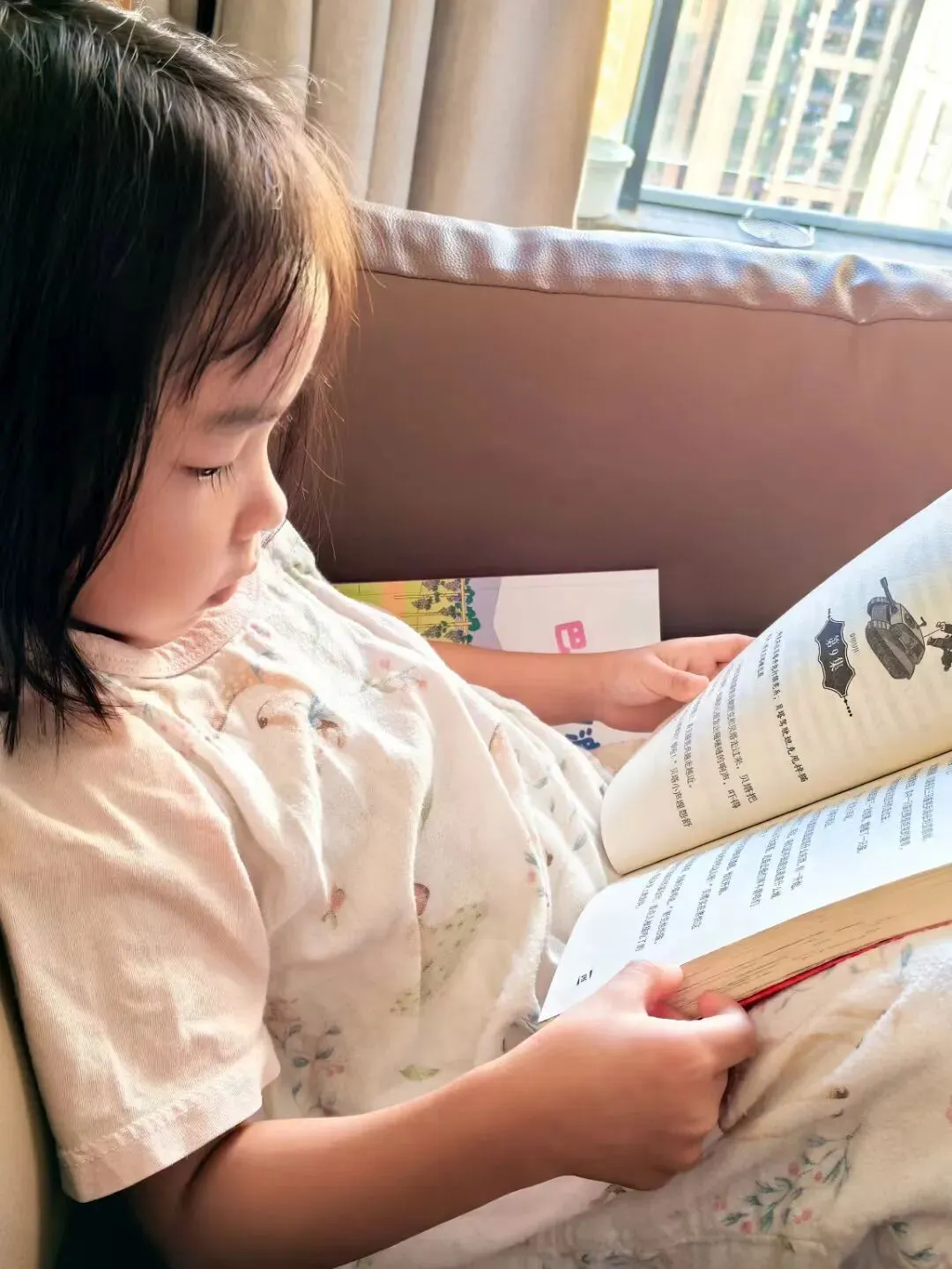 起床第一件事是看书,拖拖拉拉不肯去刷牙;吃着吃着饭,手就伸向旁边的书,不盯着的话一顿饭吃一个多小时;有时候跟小伙伴们玩着玩着,她也会自己一个人坐到旁边看起书来,完全沉浸在自己的小世界里。