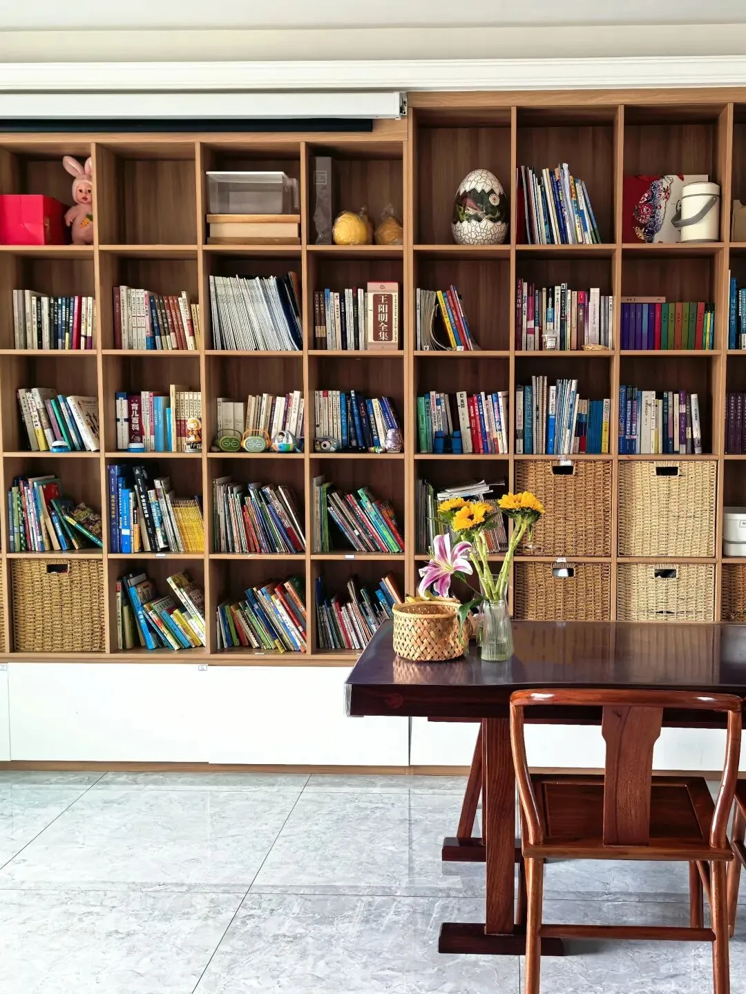书墙装好的那天,我站在它面前看了很久。然后一冲动,花了六千块买了一条大长桌。李先生极力反对,说我这是冲动消费,但我义无反顾地入了坑。