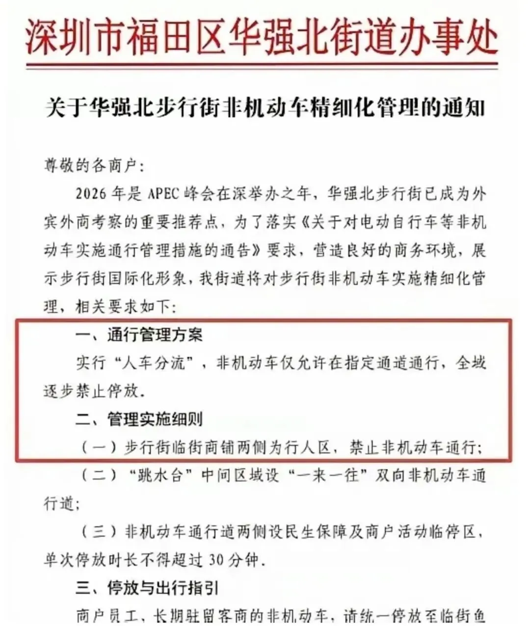 作為深圳最具代表性的地標,華強北步行街以往隨處可見電動車穿梭。但在新政實施後,有網民於4月4日發帖指,華強北(振中路至振華路區域)的電動車已「一夜清空」,地面甚至加裝了鐵欄杆以防車輛駛入。目前,華強北已嚴格執行人車分流,非機動車僅允許在指定車道通行,全域禁止停放。