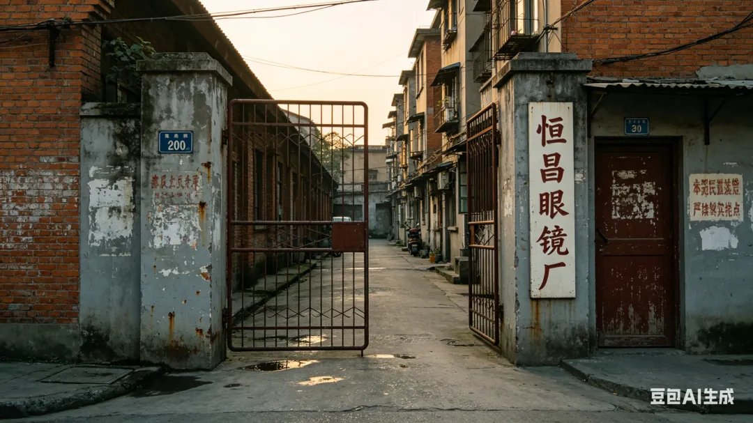 我们拐进一条小巷,在一扇铁门前停下来。铁门上面挂着一个生锈的招牌:“恒昌眼镜制造厂”。门口边上堆着一摞摞黄色纸箱,上面印着英文,几个光着膀子的工人正在往货车上搬货。老周把车停好,带我穿过堆满原材料的走廊,走到一扇写着“烧焊车间”的防火门前,推开了门。
