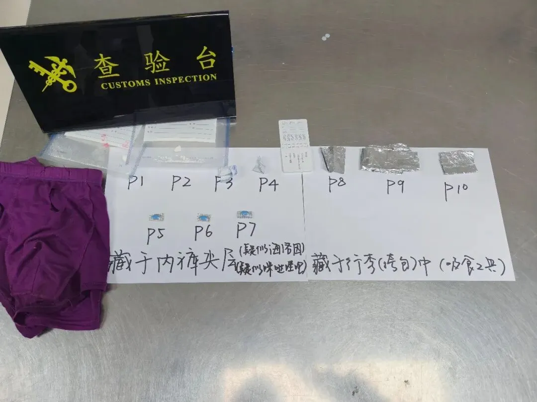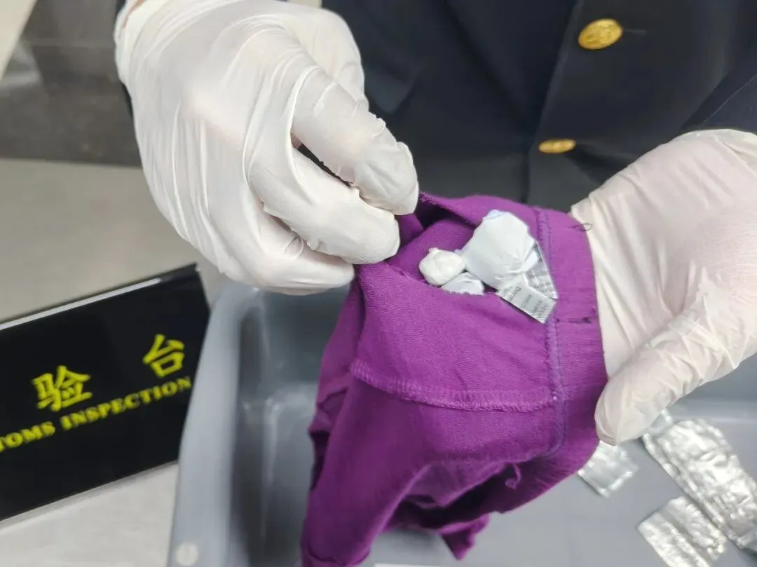 经观察,海关关员注意到该旅客牙齿上有明显黄黑色污垢,手指浮肿,回答问题前后矛盾,且一直原地踱步,情绪明显焦躁不安。经进一步检查,海关关员在该旅客身着的紫色内裤中发现用透明塑料袋密封的疑似海洛因粉末4包,以及3粒疑似含精神药品成分的药粒。