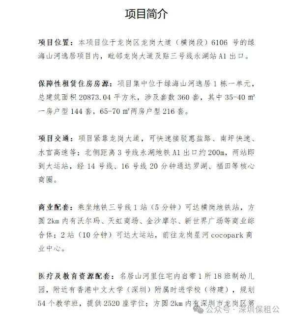 项目简况。绿海山河逸居项目保障性租赁住房位于园山街道龙岗大道1026号,单身公寓建筑面积约40平方米,二房建筑面积约为70平方米。目前剩余单身公寓29套,二房196套,一共225套!简装并配置部分家私家电。项目上述剩余房源及后续腾退房源除继续面向本硕博应届毕业生配租外,同时作为龙岗区“青年人才”房源项目,实施常态化受理配租。