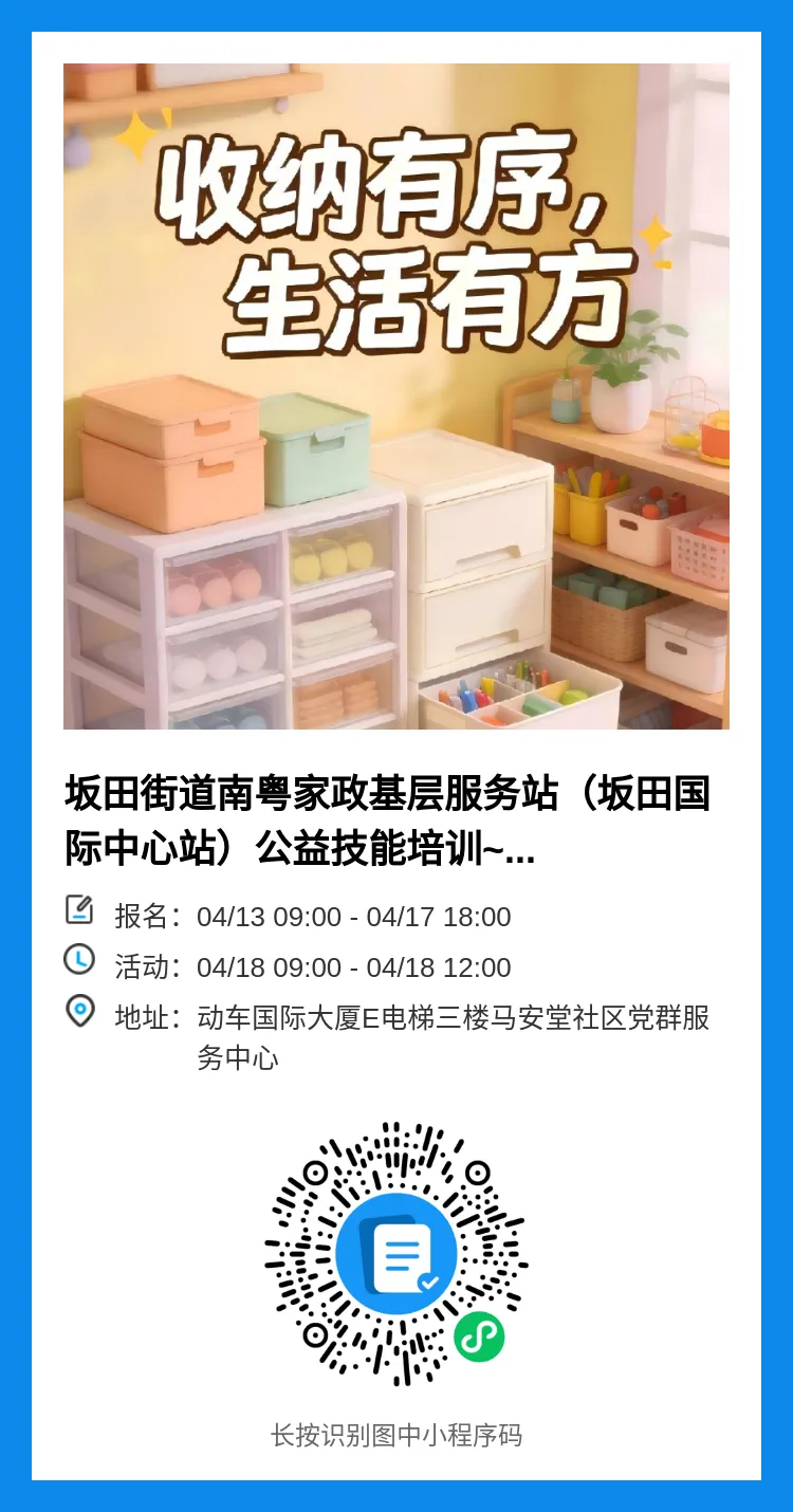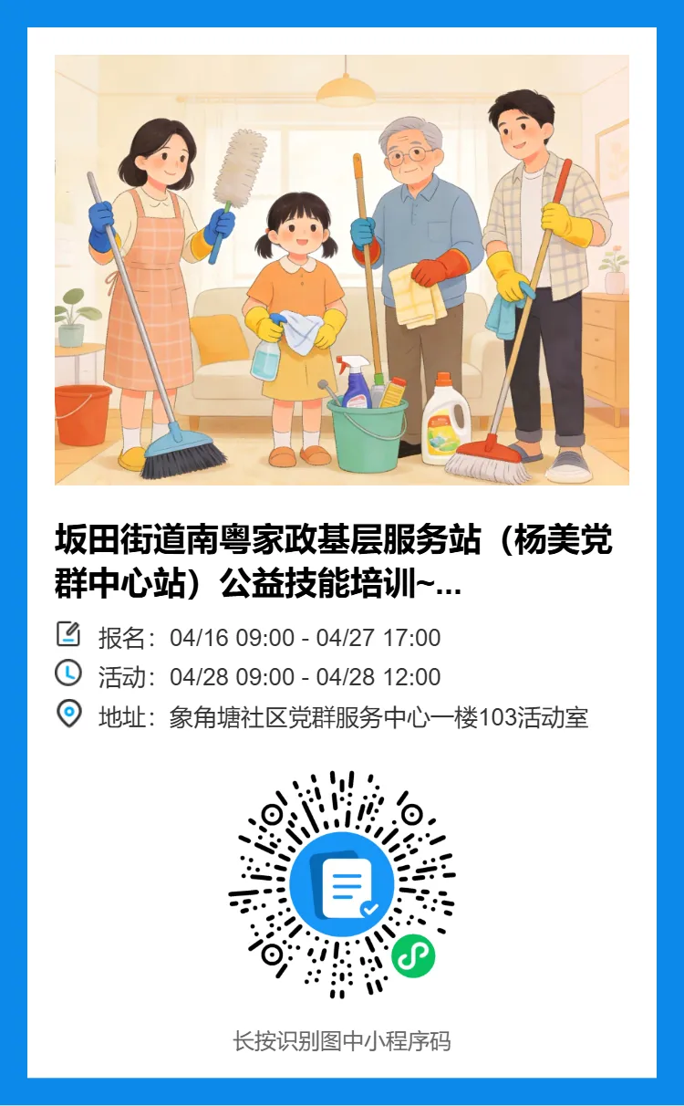 地点:坂田街道动车国际大厦E电梯三楼马安堂社区党群服务中心