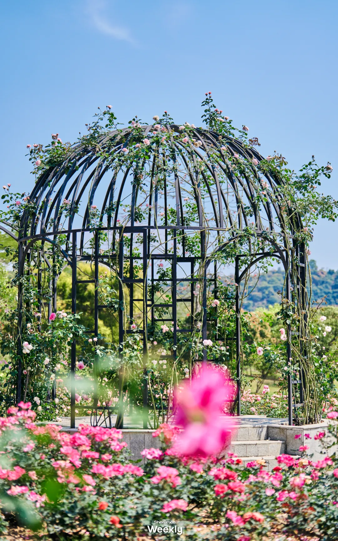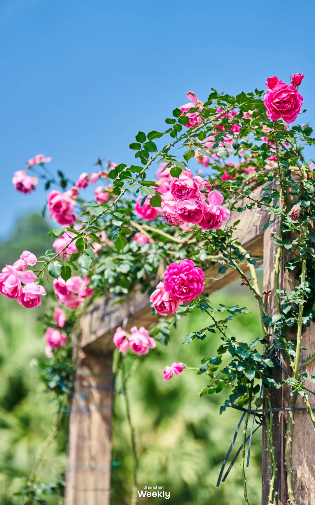 要想拍出花的美,那一定不能只拍花。花海以这座巨型鸽笼为中心,向四周延伸开来,一旁的木质拱门静静伫立在月季丛中,几株粉紫色月季花从底部缠绕而上,向阳开出了几朵最娇艳的花。
