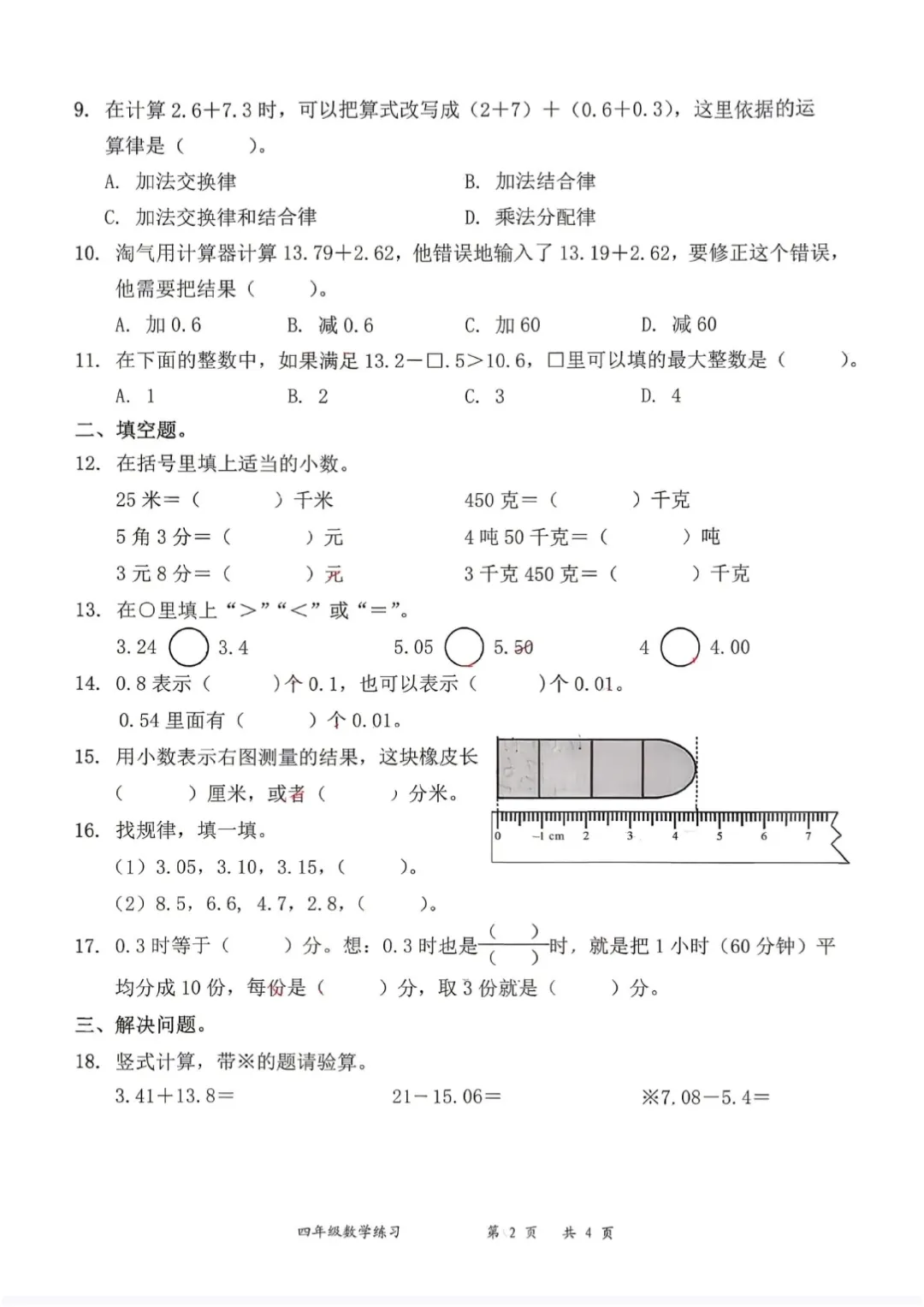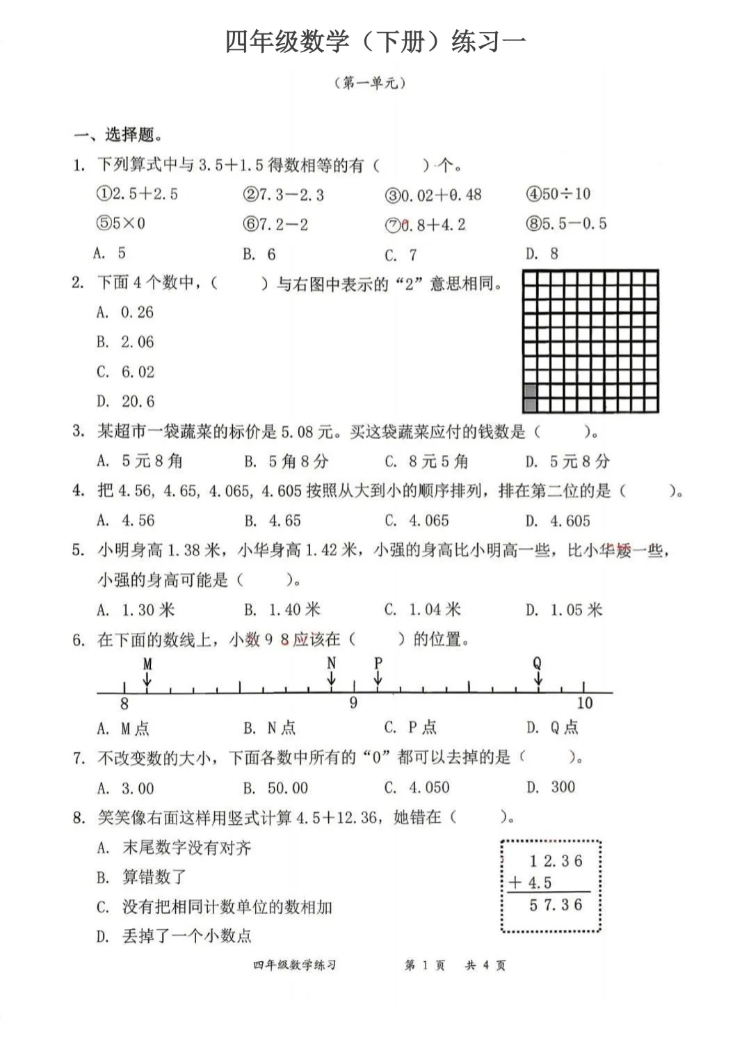 深圳市罗湖区2025-2026学年四年级数学(下册)练习一(第一单元)