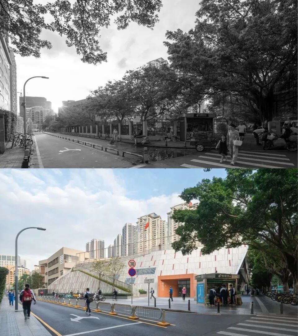 改造前,校园操场东侧紧贴道路,栅栏围墙将学校与街道截然分离,呈现出冷漠的城市界面。唯有转角处的邮政报刊亭,隐约透露出此地作为公共空间的潜质。