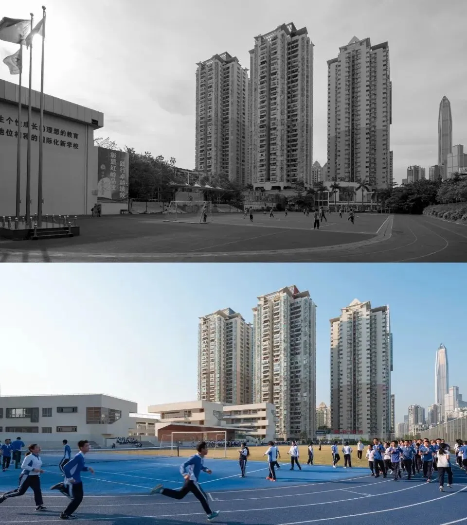 红岭中学石厦校区坐落于深圳福田的石厦片区,始建于2004年。这里是深圳大型社区的所有地,城中村与高层住宅小区交织共存,社区氛围浓郁。校园连同周围的一系列基础设施,组成街区内的公共服务网络。二十年间,随着周边中低密度的城中村转变为高密度的住宅区,红岭石厦校园的拓展空间日趋紧张。为了应对持续增长的学位需求,学校在原有场地内实施改扩建:拆除东侧体育馆及运动场地,并在原址新建教学与运动空间,实现功能补足与提升。改造后,学校规模从24班扩至36班,地上建筑面积由15000平方米增至43000平方米,空间容量提升近三倍。这一高密度挑战下,设计不仅要创造出高效便捷的功能布局,更应通过融入街道、呼应气候、联结新旧等多重对话,塑造出独具特色的校园场所。