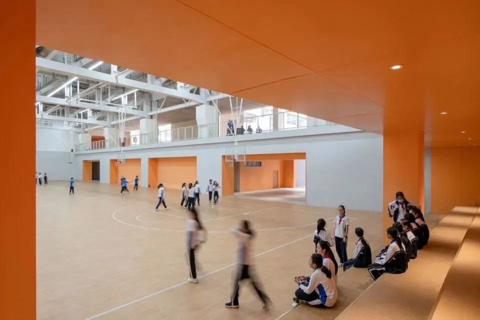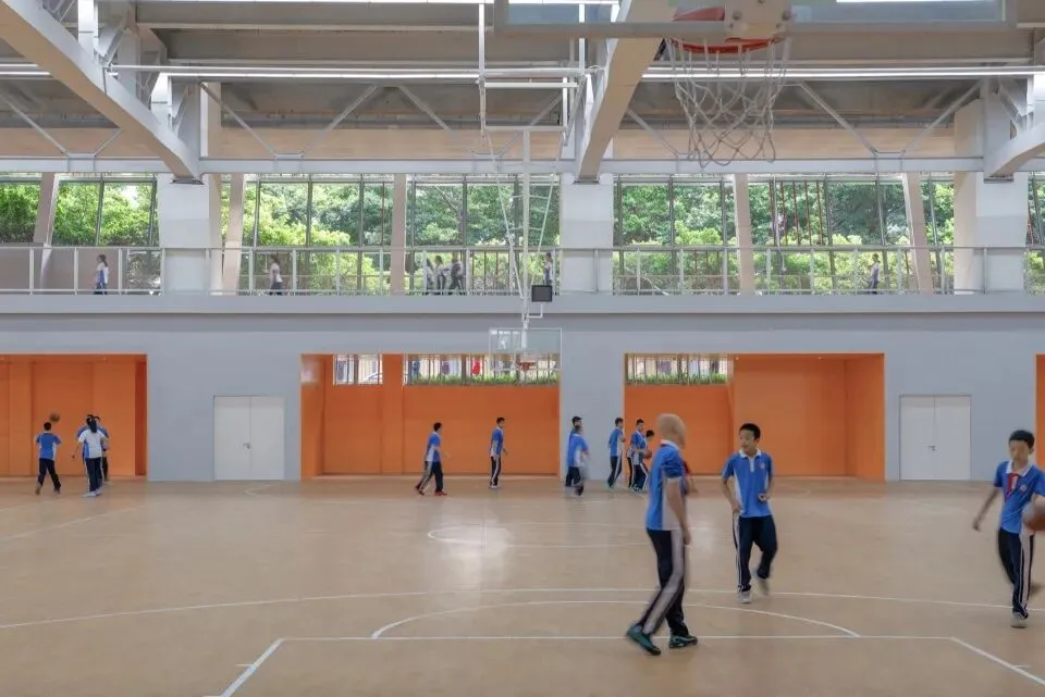 环形跑道下方是无柱的开放式篮球场。下沉的地势略低下东侧街道,利于城市自然风穿越球场与庭院,形成舒适的穿堂风。虽然标高地下2.3米,引入的风和自然光却让这里完全没有地下空间常见的封闭感。这一开阔的空间,也因此成为雨季和酷暑时全校集会的理想场地。铺设真草的主操场被抬升至7.2米的空中,不仅为校运会、开学典礼、校园音乐会等大型活动提供了专场。开阔的视野,环绕的深圳天际线,也为师生带来了独特的城市景观体验。