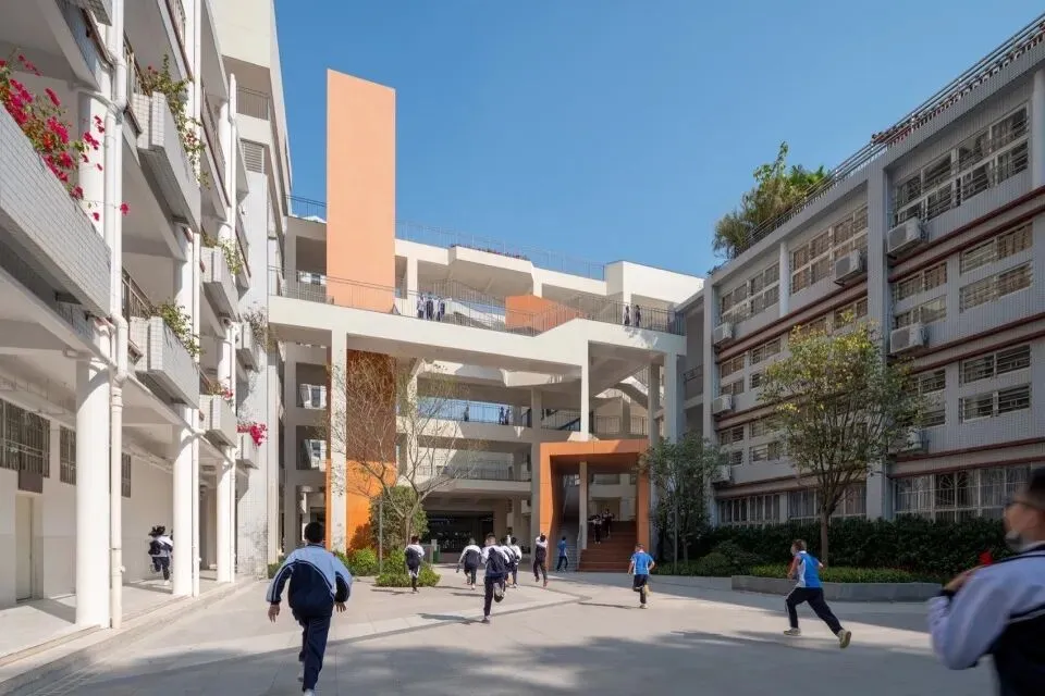 在“8+1”新校园行动计划第一季的九所学校里,红岭石厦是唯一一所被实施的改扩建项目。我们在保证校园西侧教学楼正常使用的前提下,完成了整个校园的更新与扩建。这也极大地提升了设计与施工的复杂性与挑战性。它的设计经验,也为后来燎原之火的深圳南山“百校焕新”行动埋下了伏笔。